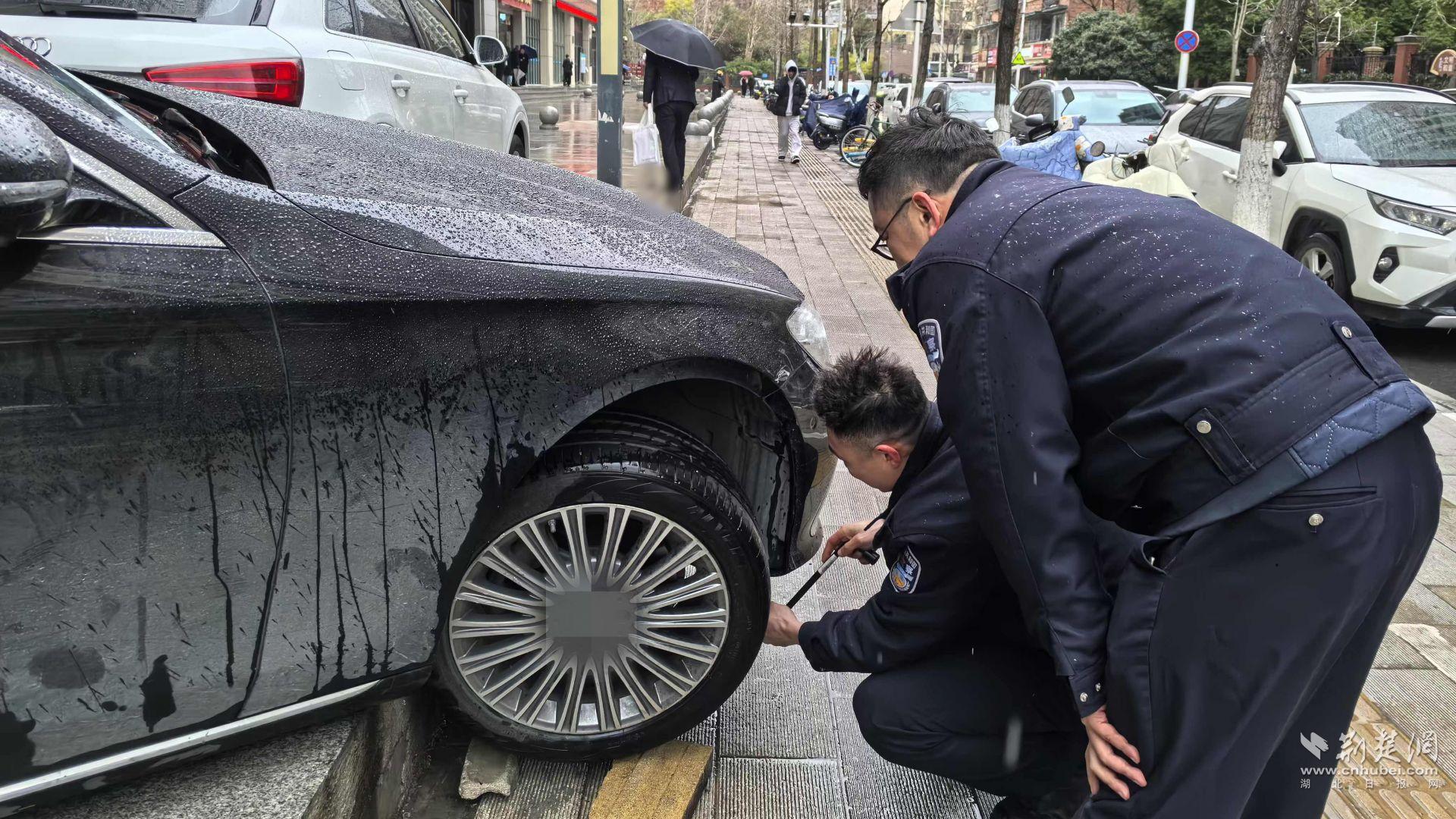 作为曾在部队服役多年的退伍汽车兵,辅警曾维检查现场情况后,发现轿车系底盘卡住导致无法行动。凭借经验,曾维就地取材找来废弃的人行道地砖,配合车载小型千斤顶冒雨展开救援。