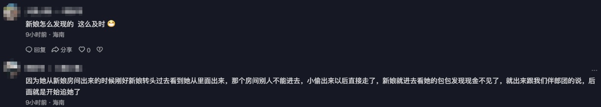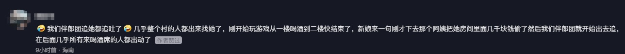 在琼山警方官方账号评论区,也有人在评论区介绍当时的情形:我们伴郎团追她都追吐了,几乎整个村的人都出来找她了,刚开始玩游戏从一楼喝酒到二楼快结束了,新娘来一句刚才下去那个阿姨把她房间里面几千块钱偷了然后我们伴郎团就开始出去追,在后面几乎所有来喝酒席的人都出动了。
