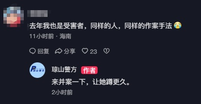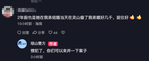 还有人在琼山警方评论区留言:“去年我也是受害者,同样的人,同样的作案手法”“2年前也是她在我弟结婚当天在灵山偷了我弟媳好几千,捉住好”,对此琼山警方也对网友喊话:“来并案一下。”