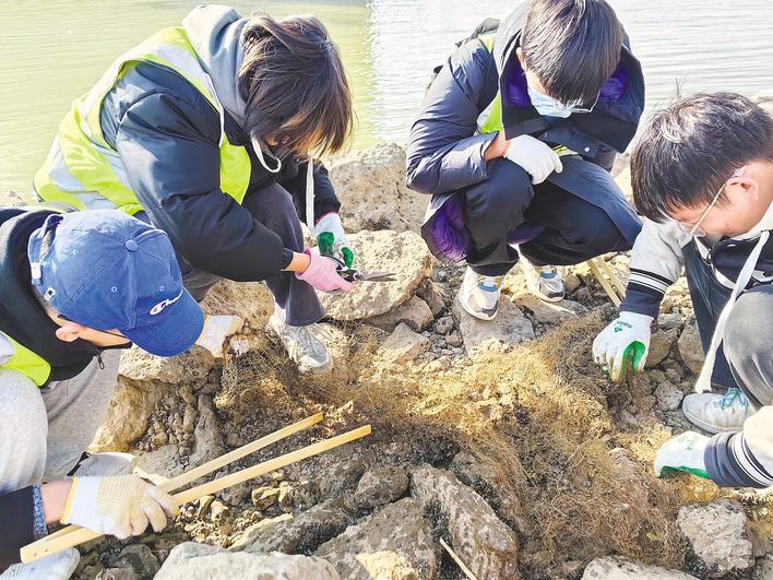 华中农业大学的志愿者在沙滩上清理砂砾深处垃圾。