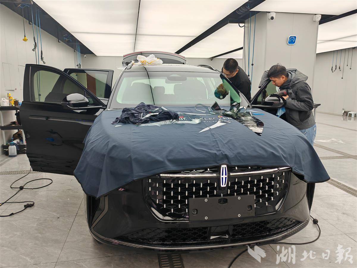 前端消费活跃,也带动了汽车后市场的繁荣。位于洪山区的龙膜全球臻选店大厅内,停着不少还没上牌的新能源车,这些车辆或等待着换车衣,或等待贴玻璃膜、装脚踏垫。在裁膜房,技术师傅在电脑中输入车型信息,机器就像裁缝一样,立马给车型裁出了完美匹配的衣服。