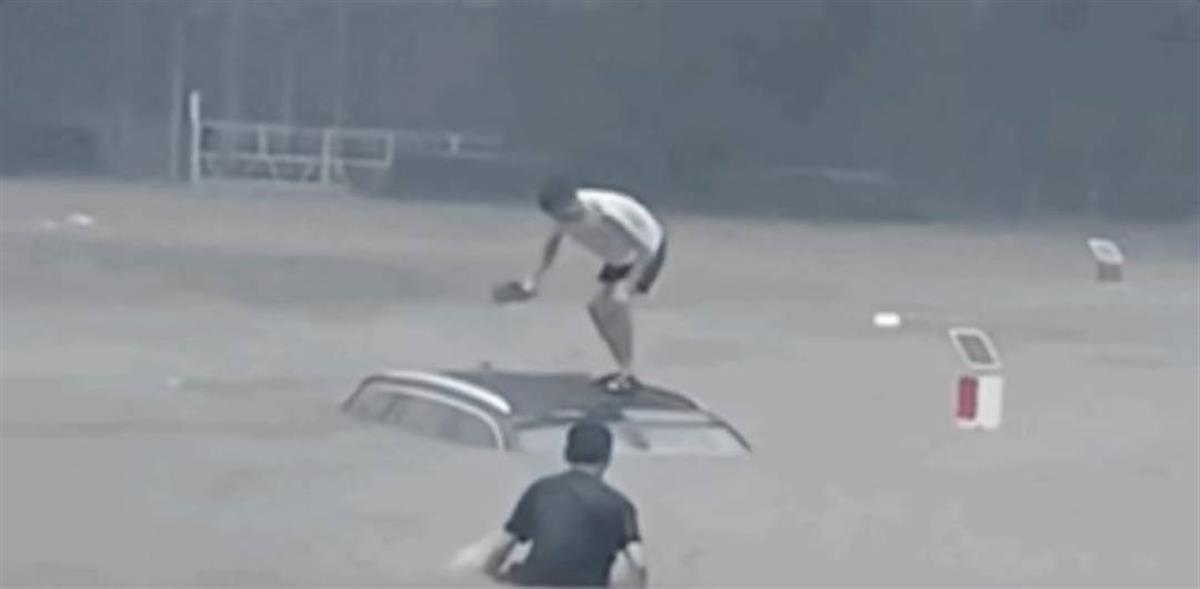 李坤朋所在酒店的员工拍下这惊魂一幕:李坤朋站在已快被水淹没的车顶,用菜刀不住地砸砍车顶,并尝试破窗救人。几位市民也前来帮忙,他们齐心协力终于破车,并携带了水桶,将2名小孩和1名老人救出。