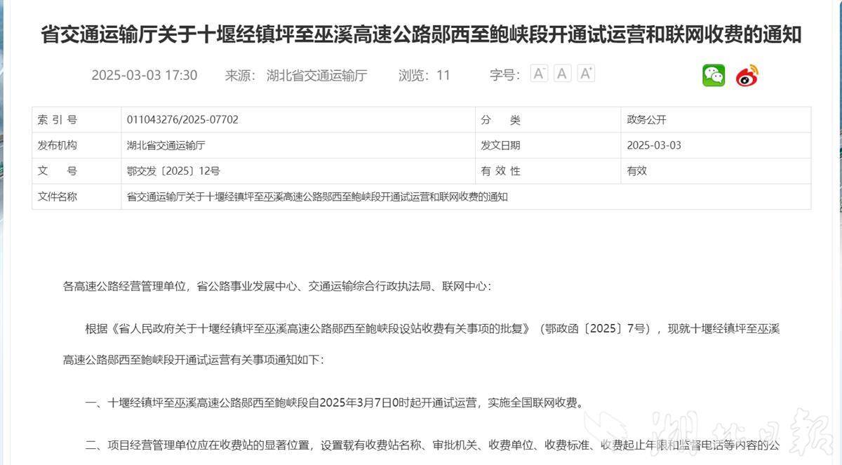 湖北日报讯(记者余宽宏、刘汉泽 通讯员张鹏宇、姜谷平、徐光意、李尚菲)沿线群众多年来的期盼终于实现了,湖北也迎来一条新的交通大动脉。3月3日,湖北省交通运输厅发布关于十堰经镇坪至巫溪高速公路郧西至鲍峡段(简称十巫北)开通试运营和联网收费的通知,该路段自2025年3月7日0时起开通试运营,实施全国联网收费。