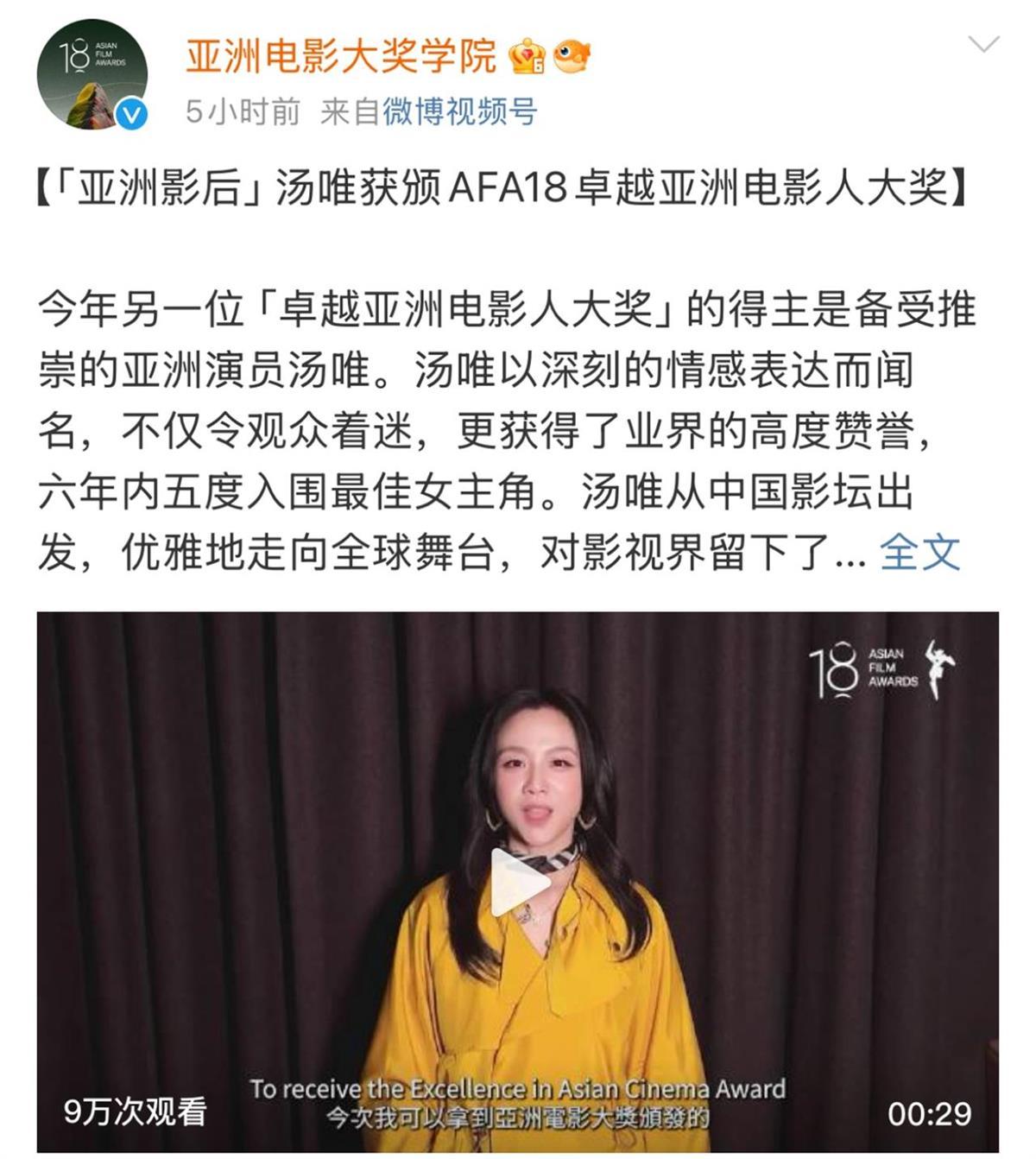 亚洲电影大奖官方账号还发布了一则汤唯回应获奖的视频,她在视频中以熟练的粤语说,自己很开心可以拿到这个奖,3月16日与大家颁奖典礼见。
