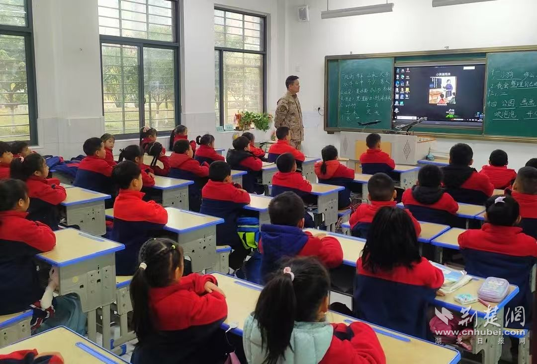 荆楚网(湖北日报网)讯(通讯员常梦星)为增强学生国防意识,培养爱国主义精神,3月4日,江陵县退役军人陈鹏走进县郝穴小学,为一年级的学生们开展了一堂生动的国防教育课。
