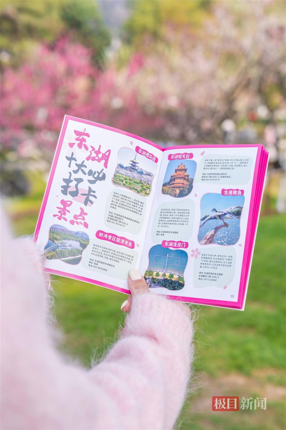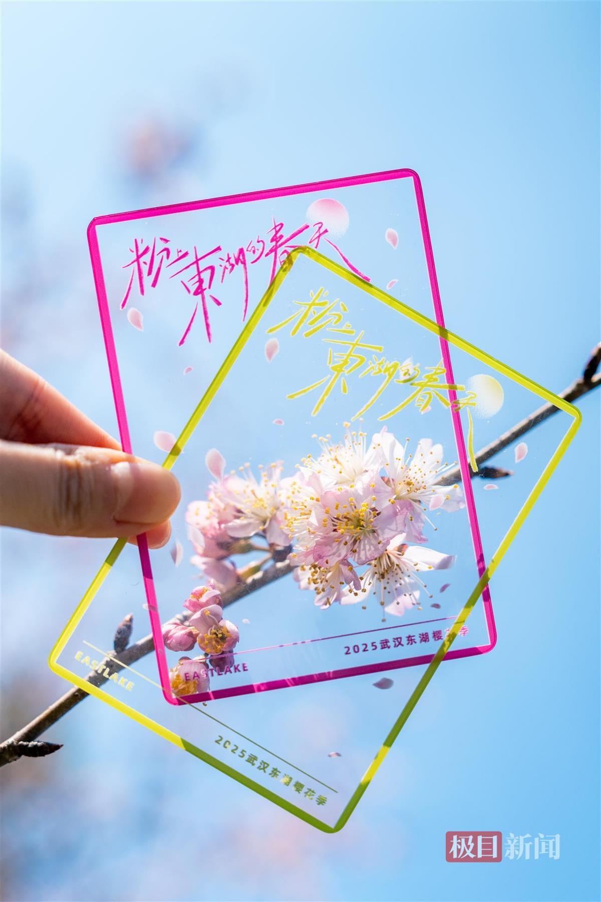 “热粉包”包内还有四大创意周边:《东湖樱花季漫游指南》内含东湖热门景点+热门线路推荐,兼具集章功能;透卡可以框住美景、樱花、人像,定格东湖记忆;扇形卡是一叠东湖趣味知识卡册,同时也是一把实用的扇子;便携化妆镜能用来开发东湖拍照创意,发现东湖风光新视角。这些文创产品通过“边玩边集章”的互动模式,引导游客深度感受东湖樱花季。游客只需在活动期间发文集赞,即有机会免费获得这份精美的东湖春日礼物。