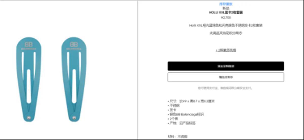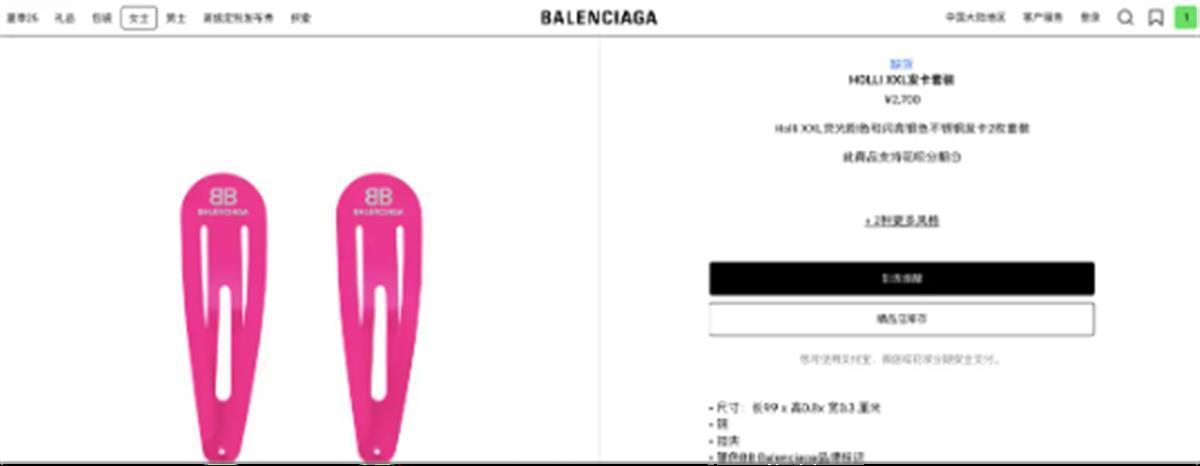 最近,巴黎世家推出了一款发卡,售价2700元。官网介绍称,该款发卡尺寸长9.9cm、高0.7cm、宽0.2cm,材质为不锈钢,上面印有“BB Balenciaga标识”。