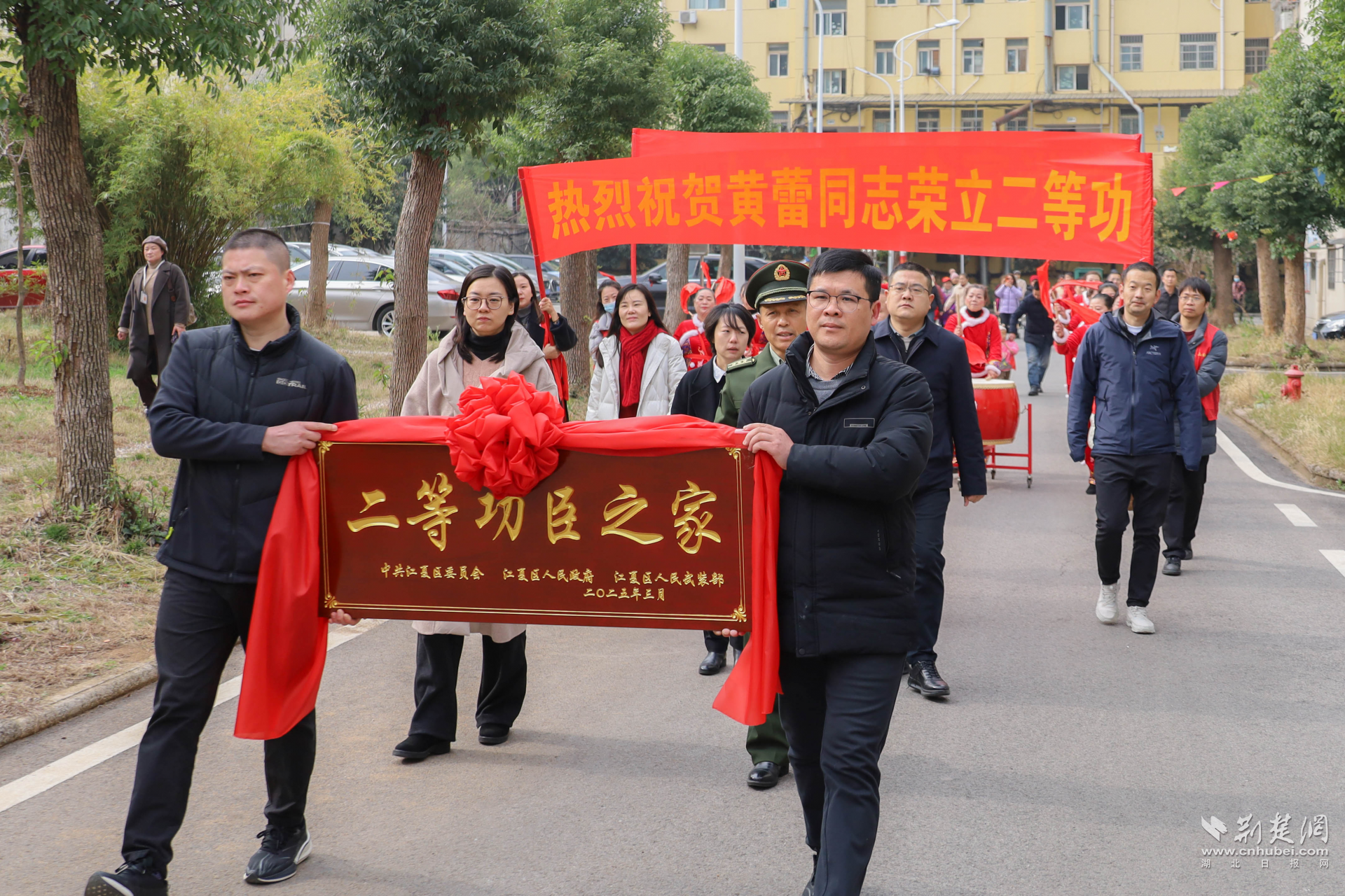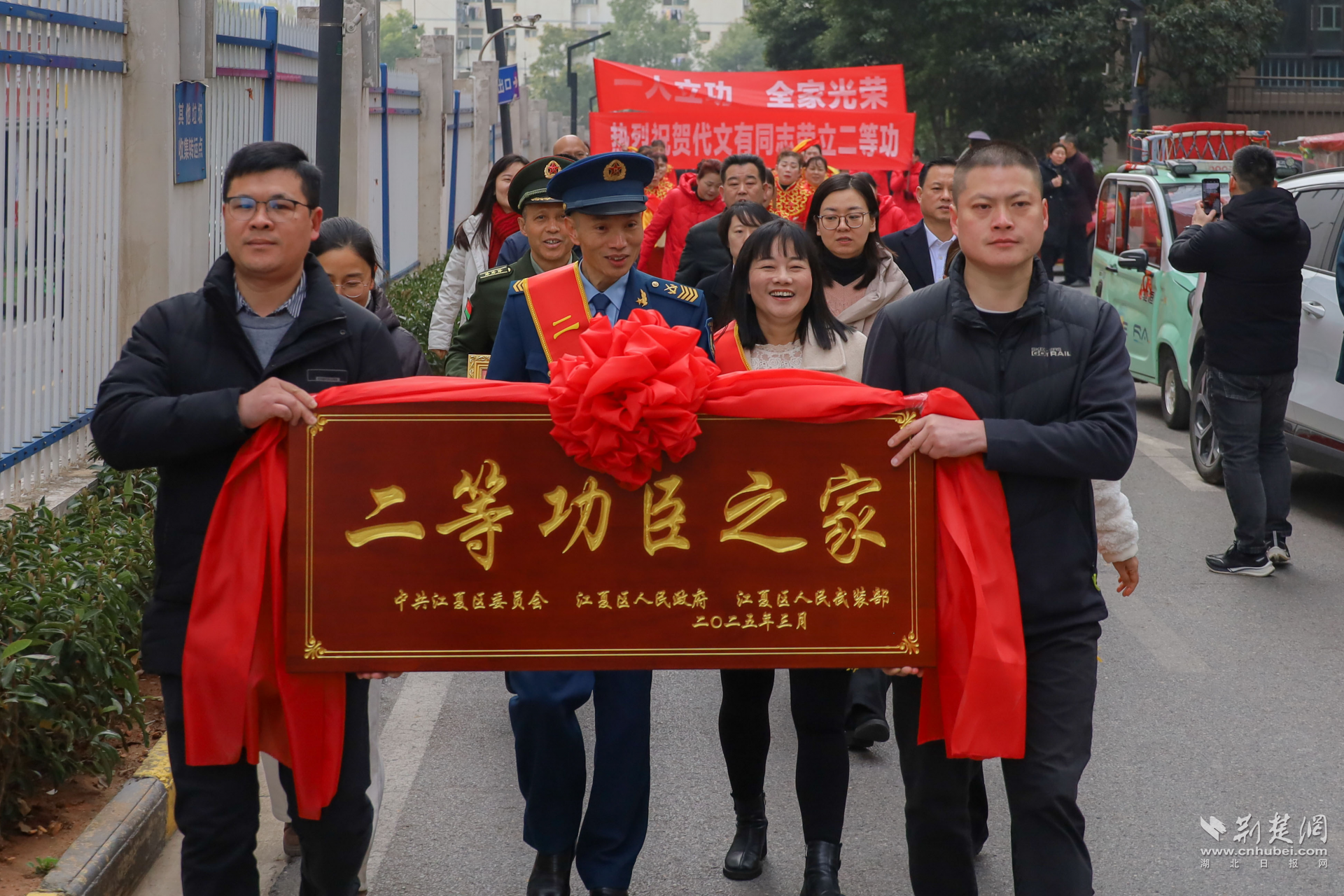 荆楚网(湖北日报网)讯(通讯员舒威)为进一步激发江夏区广大官兵安心服役、献身国防的光荣感和使命感,持续做好双拥工作,3月6日,中共江夏区委、区政府、区人武部、区退役军人事务局和相关街道(管委会)联合组成送喜报队伍,分别为两位荣立二等功的现役军人代文有和黄蕾家庭送去“二等功臣之家”牌匾、喜报、奖励金和慰问品。