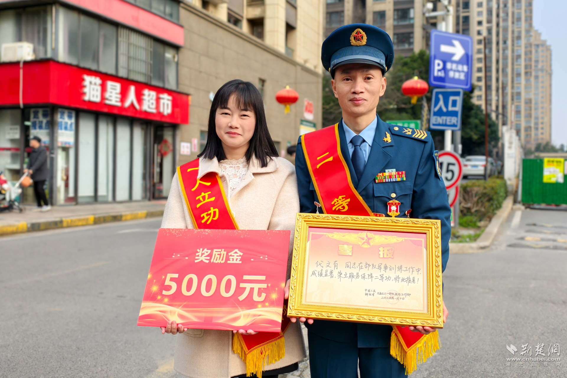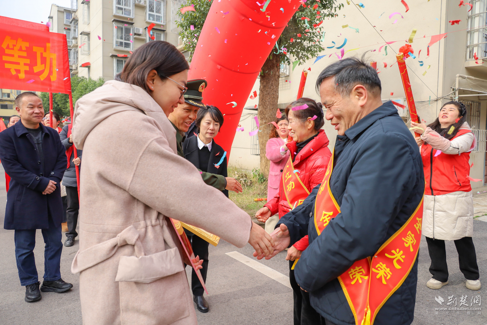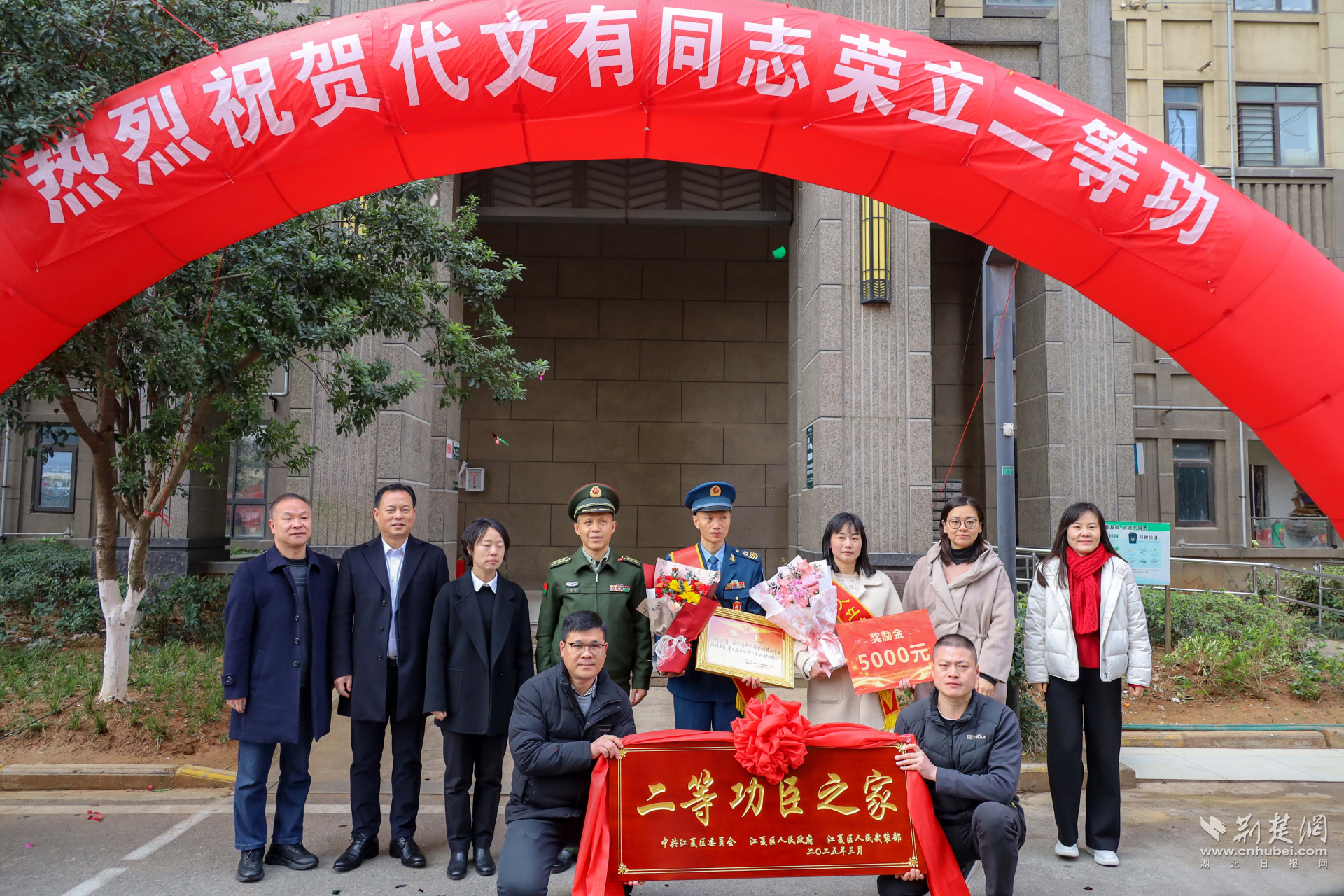 上午9时,在江夏区大桥产业园大桥社区俪湖天地小区,送喜报队伍在小区门口整装列队,两名工作人员昂首挺胸,手托红底金字的“二等功臣之家”牌匾走在最前方。二等功臣代文有身着笔挺军装,胸戴军功,肩披绶带,与妻子宋建芳和军地领导并肩而来。