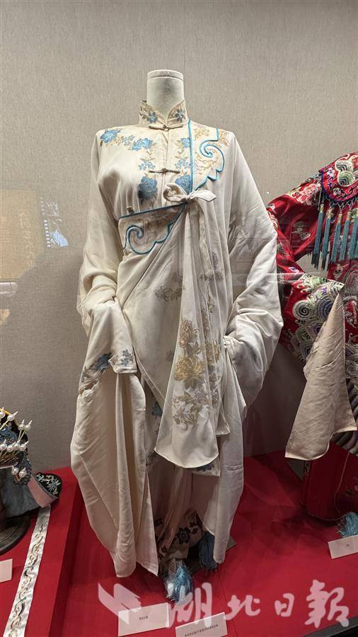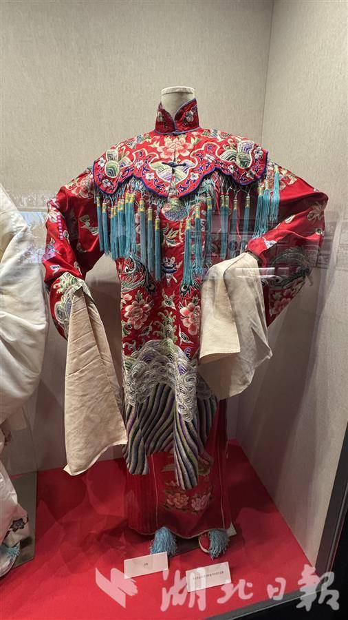 展品中,两件红团女蟒、绣花白帔分别是陈伯华演出《贵妃醉酒》《宇宙锋》等剧目的服装。张志文介绍,这两件戏服都极具代表性,其中红团女蟒遍身绣满凤凰、牡丹,在陈伯华演出的《贵妃醉酒》《状元媒》《宇宙锋》等经典剧目中都有亮相。而绣花白帔则是陈伯华在《宇宙锋》中的独创,这套戏服外罩白纱斜系衣襟,适用于剧中人物赵艳容装疯的场景,京剧、豫剧和汉剧的《宇宙锋》并称“三锋”,只有汉剧采用白帔,京剧、豫剧都是黑色。