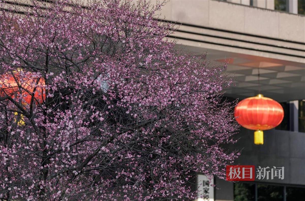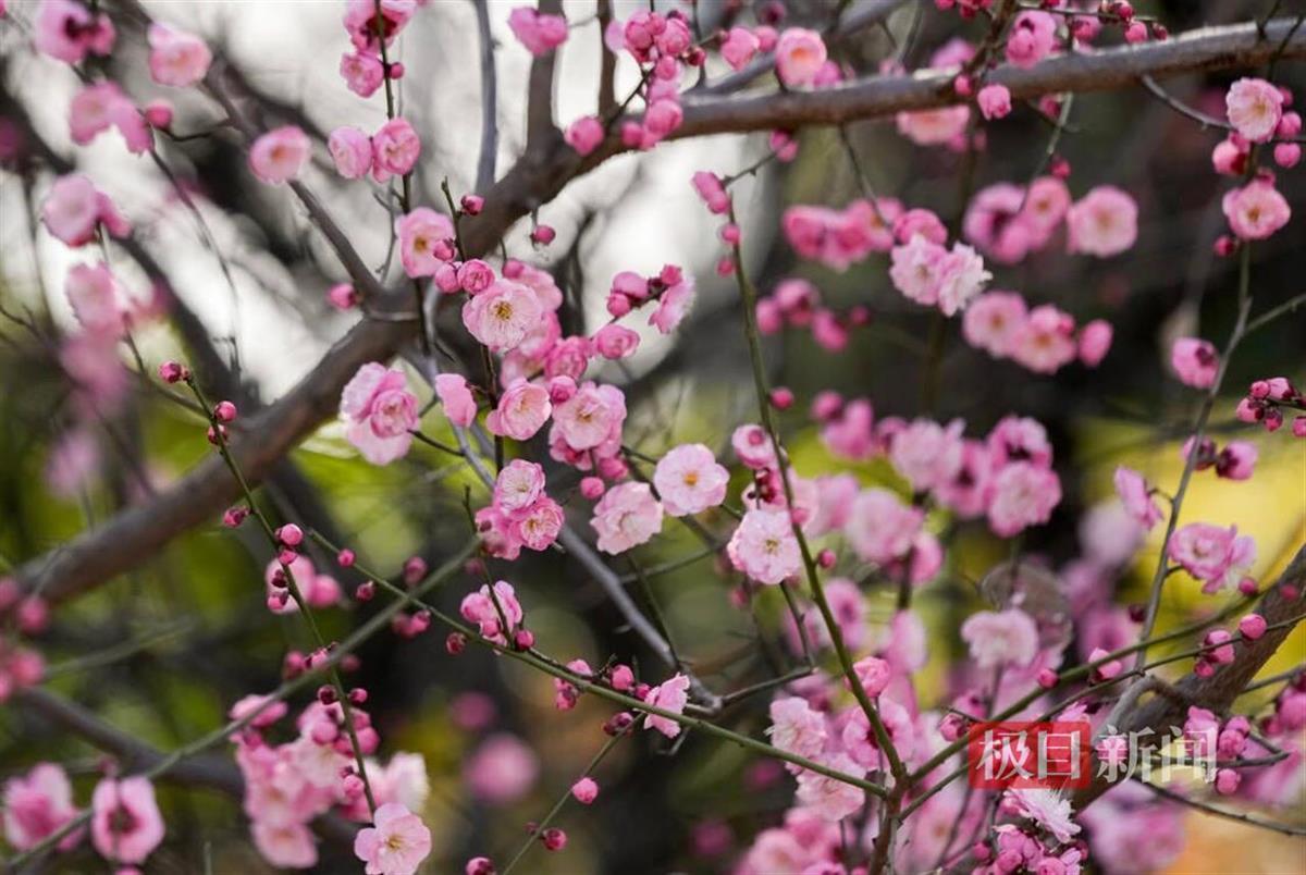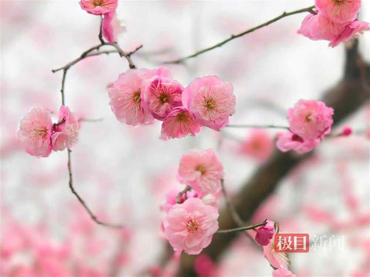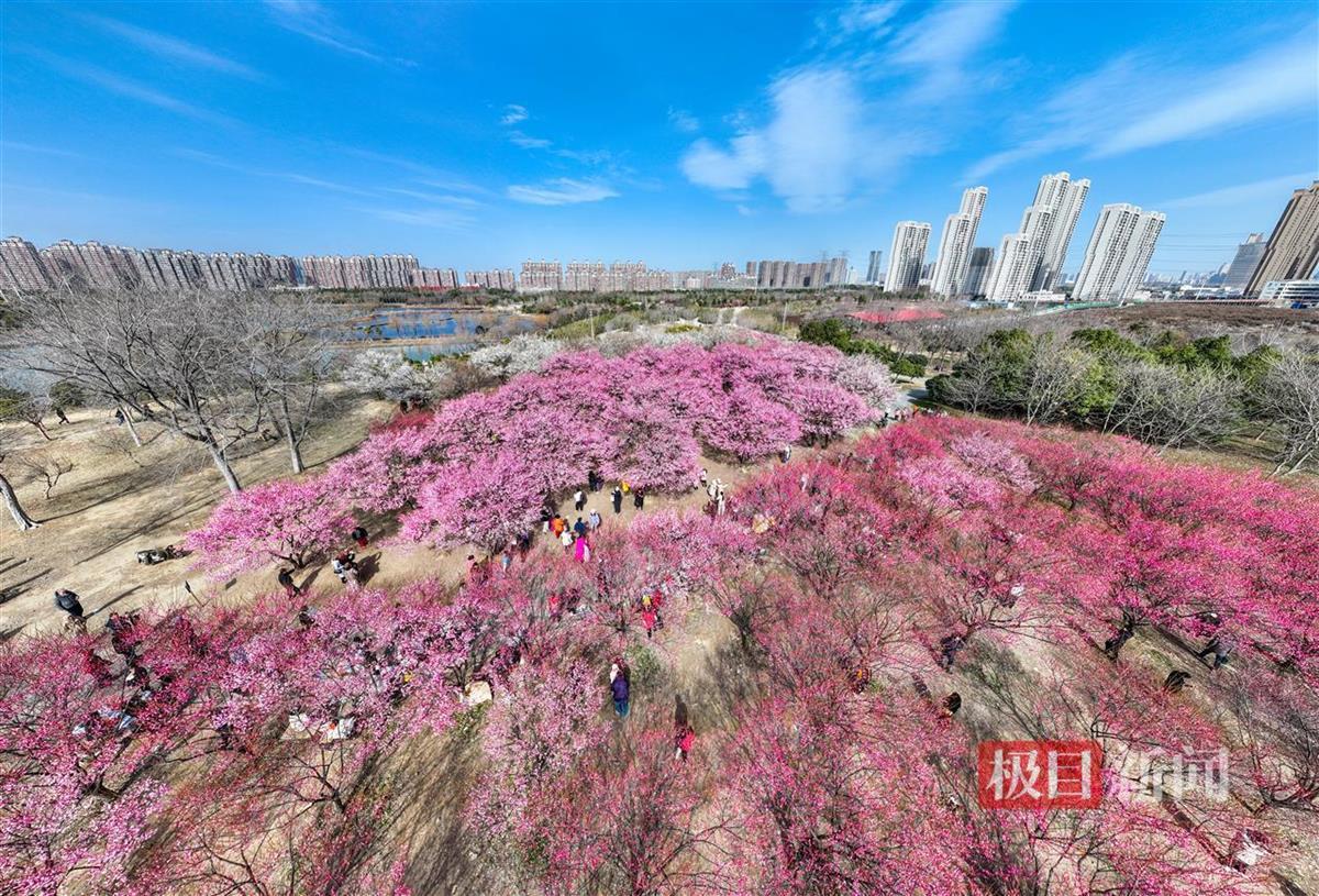 近一个月,公园里,东湖畔,大道旁,江滩沿线,小区大院,作为武汉市市花的梅花绽放全城,从空中俯瞰,红梅像是给城市轻柔地晕染上了一抹抹胭脂。