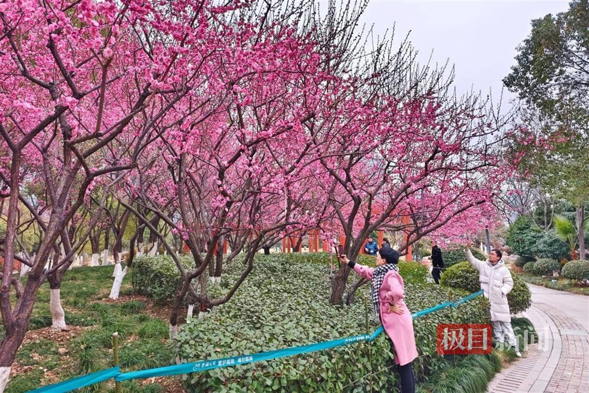 沙湖公园,中山公园,解放公园,竹叶海公园,一片片红梅林生发,一串梅花枝条上布满柔美的梅花,吸引大量游客拍照,游客们笑意满满,愉悦之情溢于言表。