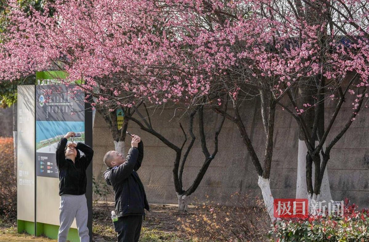 “像是一大片红云浮在竹叶海公园上空。”肖先生用无人机定格下一大片红梅林。沙湖公园里,游客们漫步赏梅,拍照分享朋友圈。