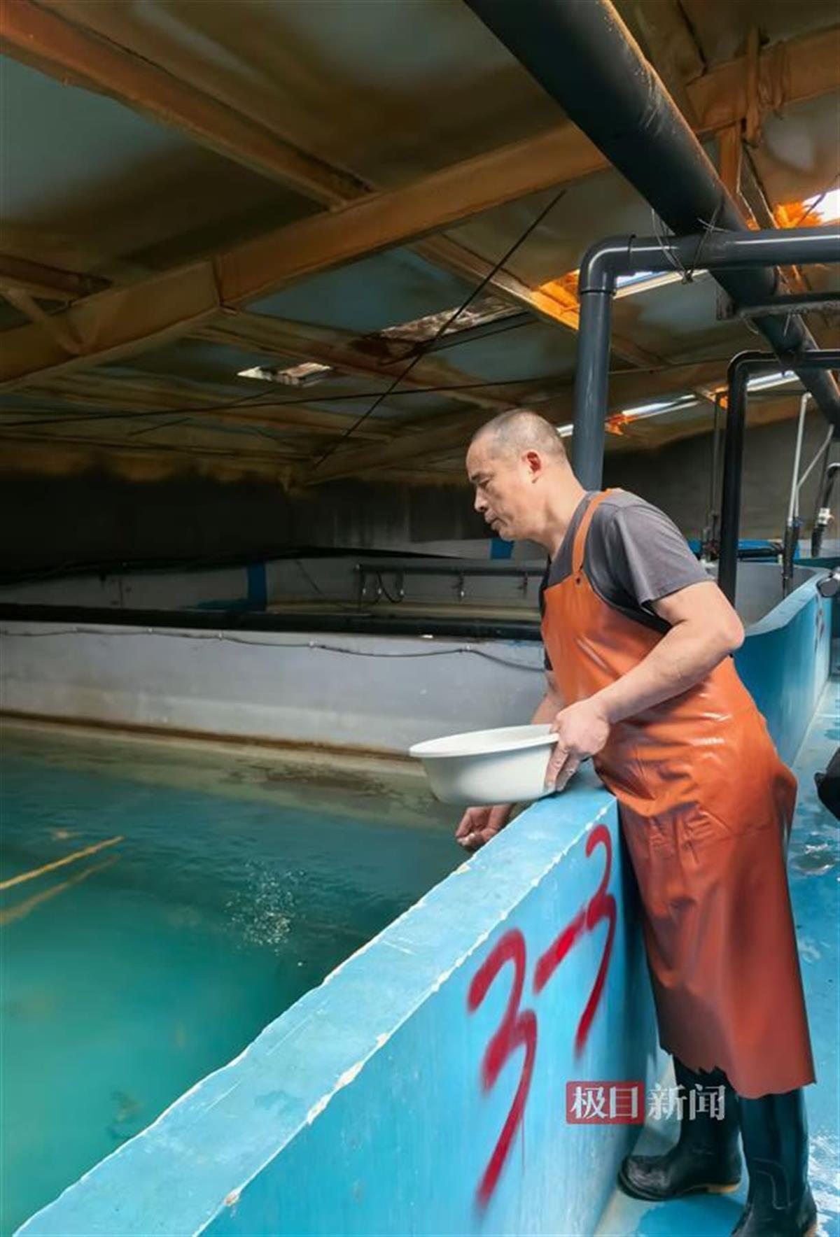3月6日下午1时许,阳光明媚,黄陂气温舒适。经过消毒,极目新闻记者走进隔离保温严格的武汉天健沼虾繁育科技公司3号沼虾良种种苗扩繁车间,顿时感觉仿佛进入了初夏时节。车间内,两排放养着沼虾亲本的水泥池顺次排列,公司的养殖技术人员正在投喂亲虾的午餐——糯米。