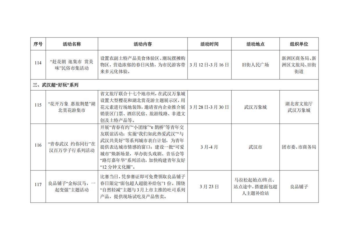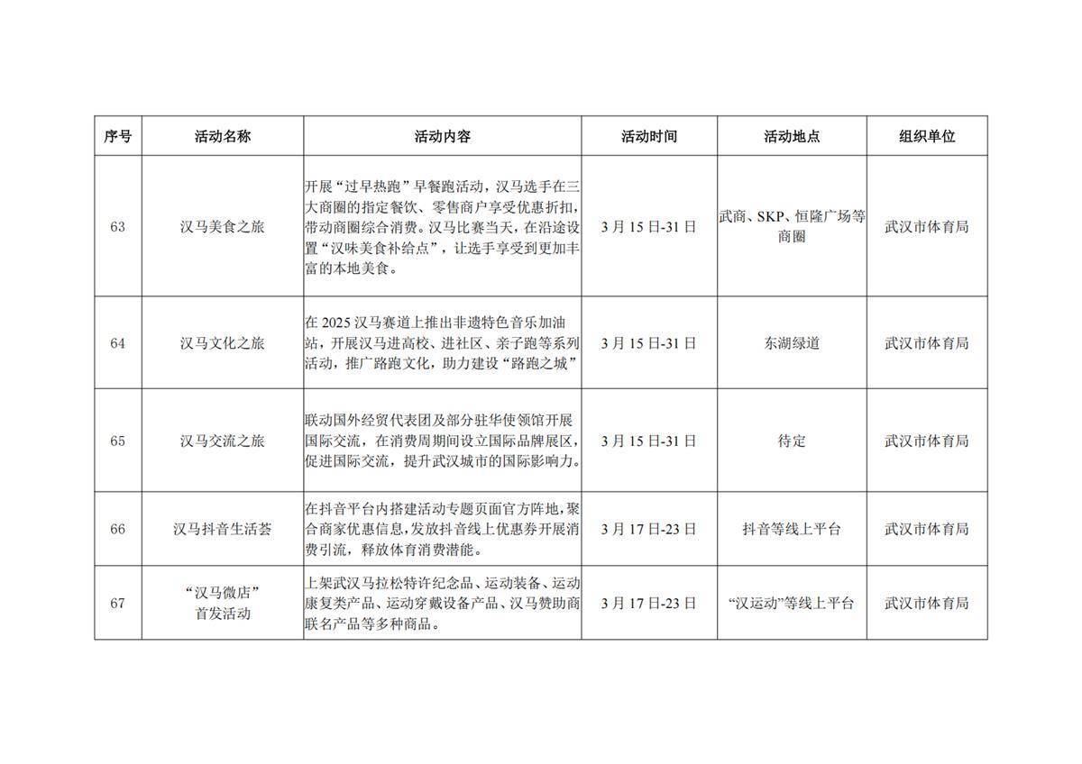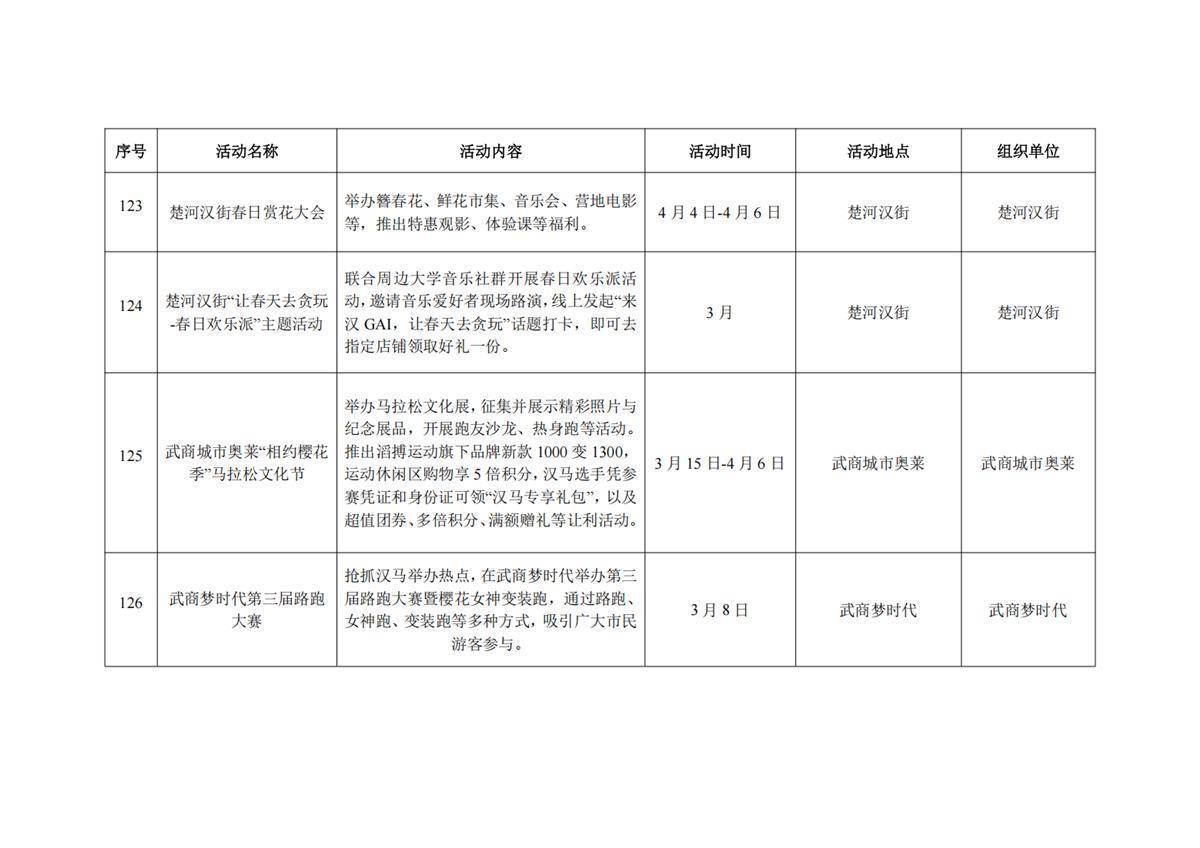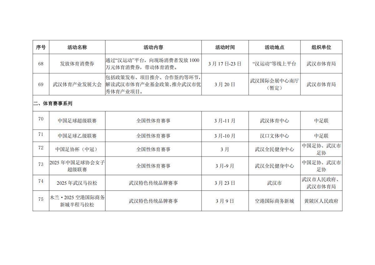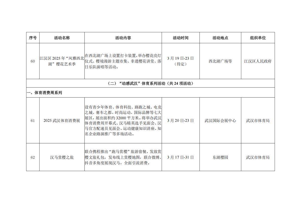 包括武汉马拉松、武汉体育消费周等20多项体育活动。3月23日武汉马拉松开跑,3月17-23日举办武汉体育消费周。其间,赏樱季、汉马、商业助消费多方联动,赛事与商业、赏花、美食、音乐融为一体,有汉马美食生活节、非遗特色音乐加油站、赛事特色直播等。