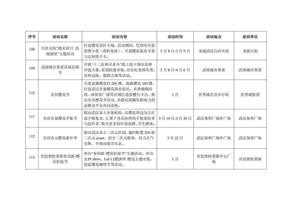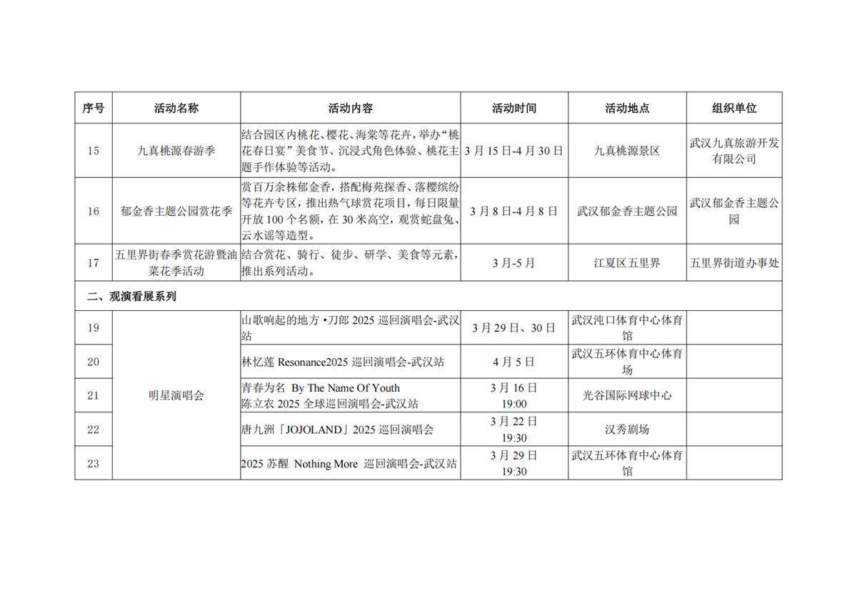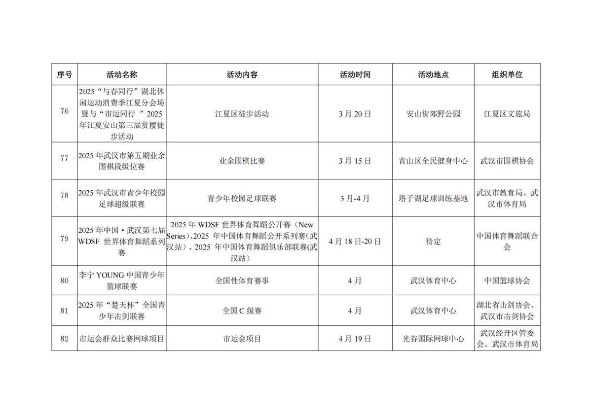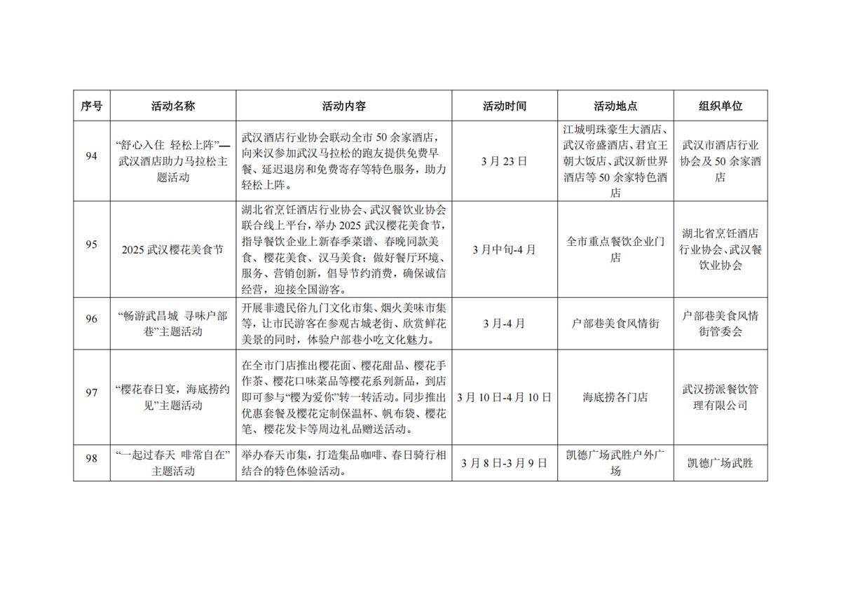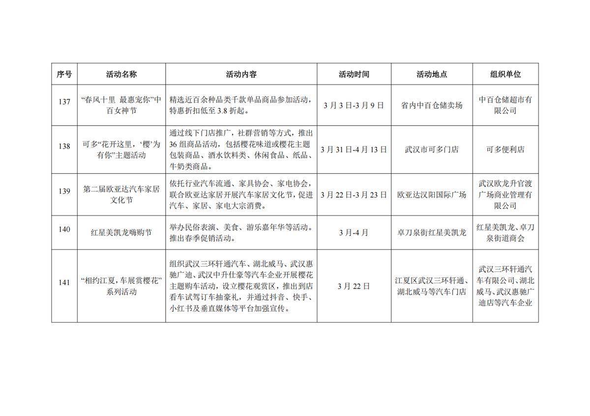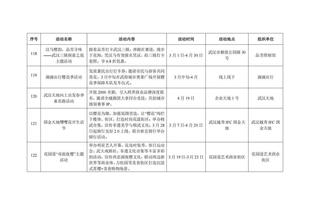 包括武汉马拉松、武汉体育消费周等20多项体育活动。3月23日武汉马拉松开跑,3月17-23日举办武汉体育消费周。其间,赏樱季、汉马、商业助消费多方联动,赛事与商业、赏花、美食、音乐融为一体,有汉马美食生活节、非遗特色音乐加油站、赛事特色直播等。