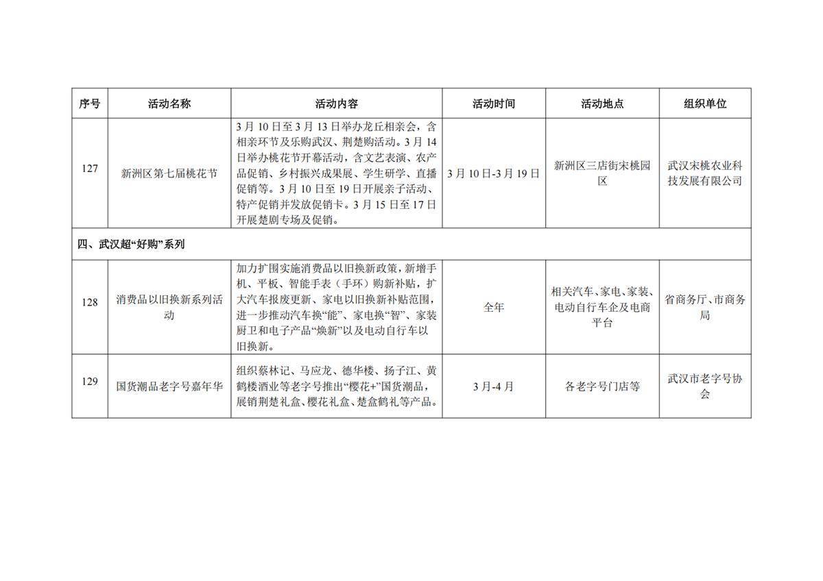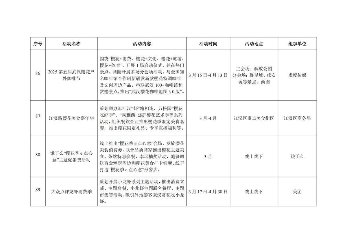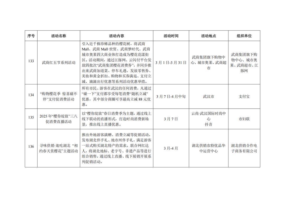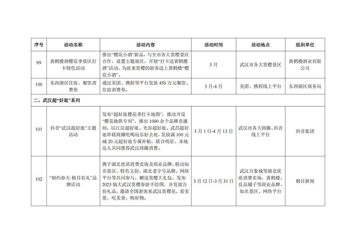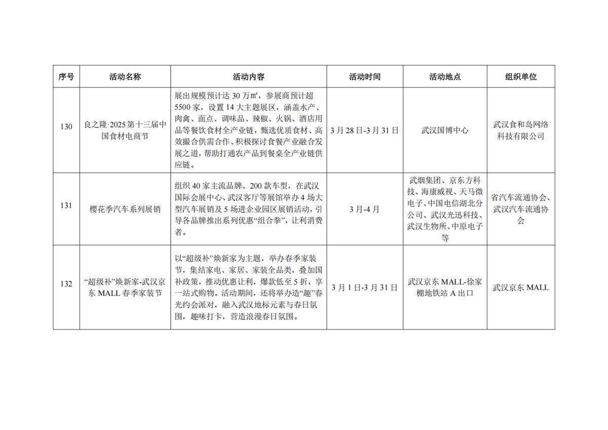 包括武汉马拉松、武汉体育消费周等20多项体育活动。3月23日武汉马拉松开跑,3月17-23日举办武汉体育消费周。其间,赏樱季、汉马、商业助消费多方联动,赛事与商业、赏花、美食、音乐融为一体,有汉马美食生活节、非遗特色音乐加油站、赛事特色直播等。