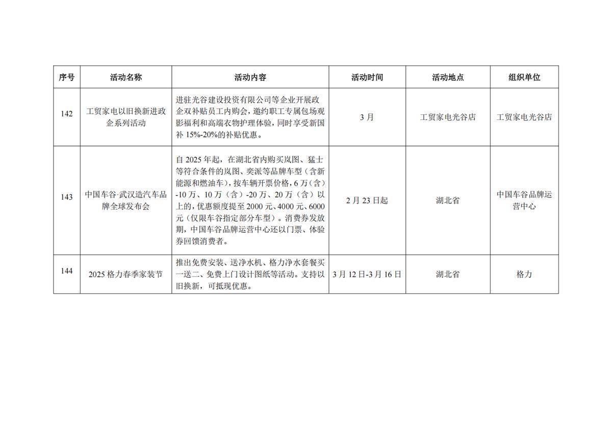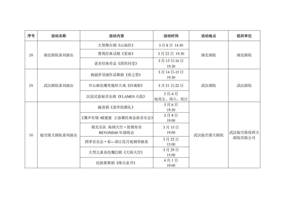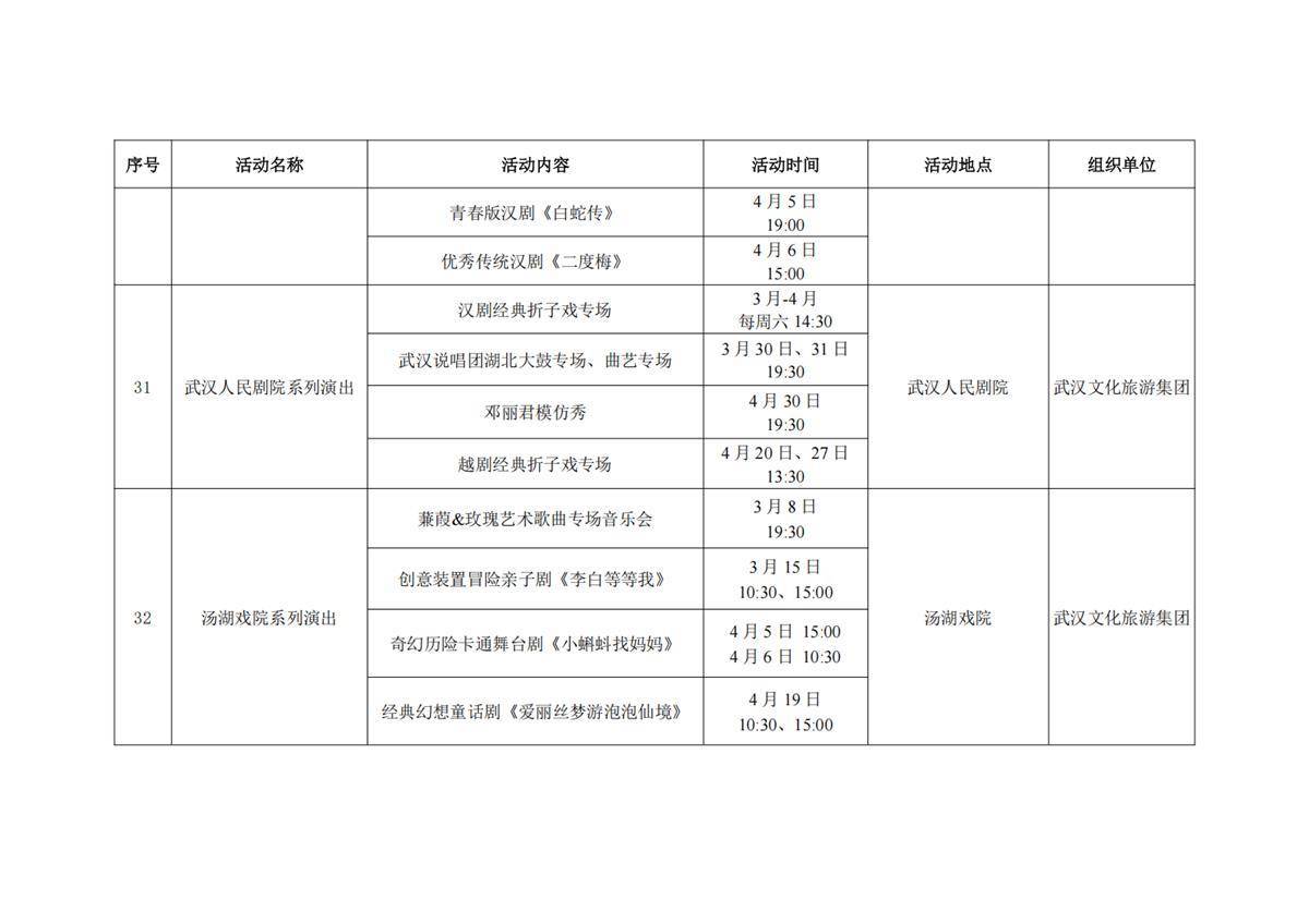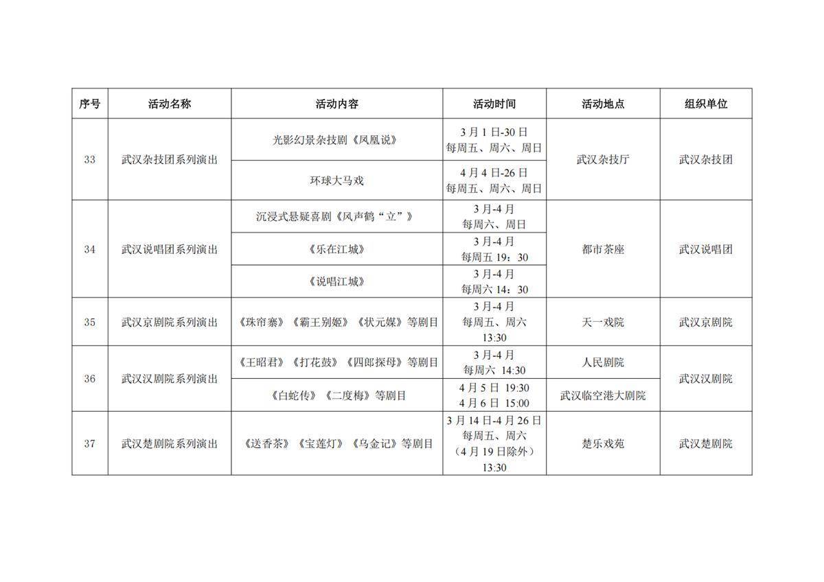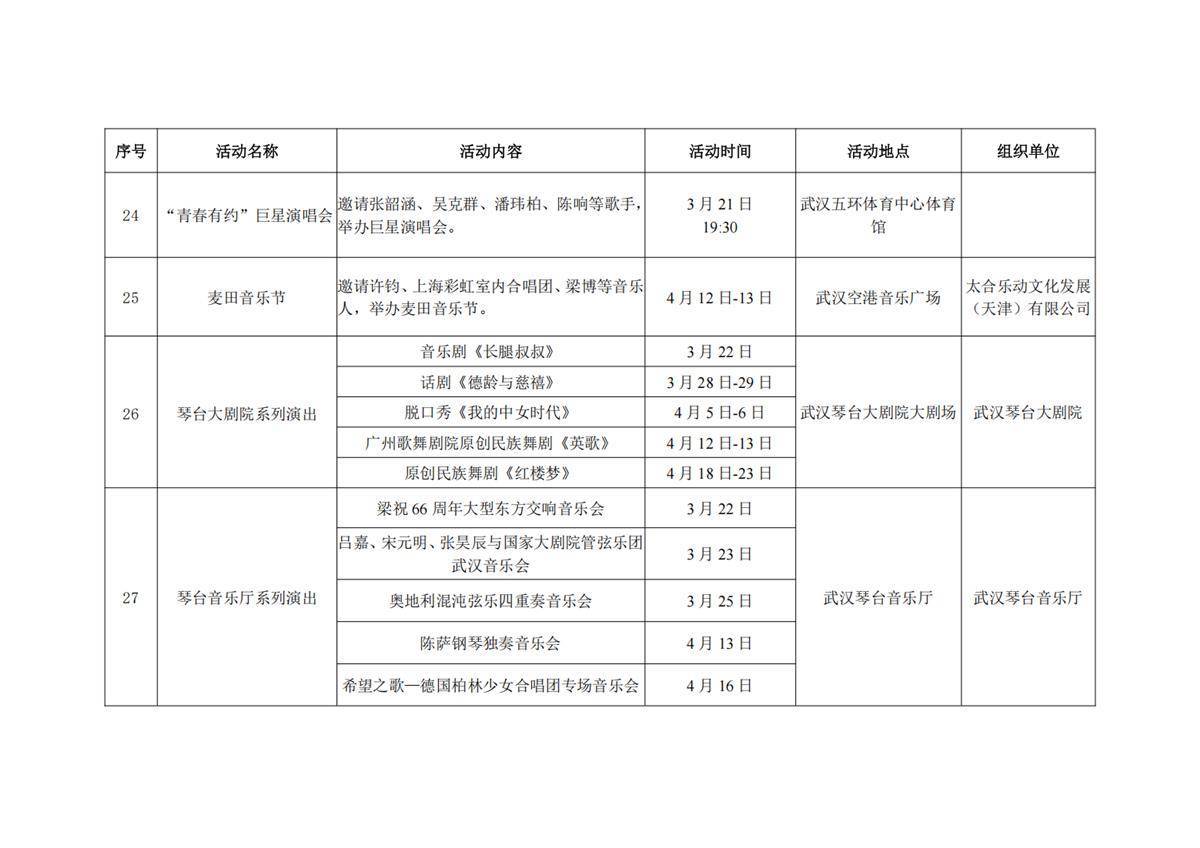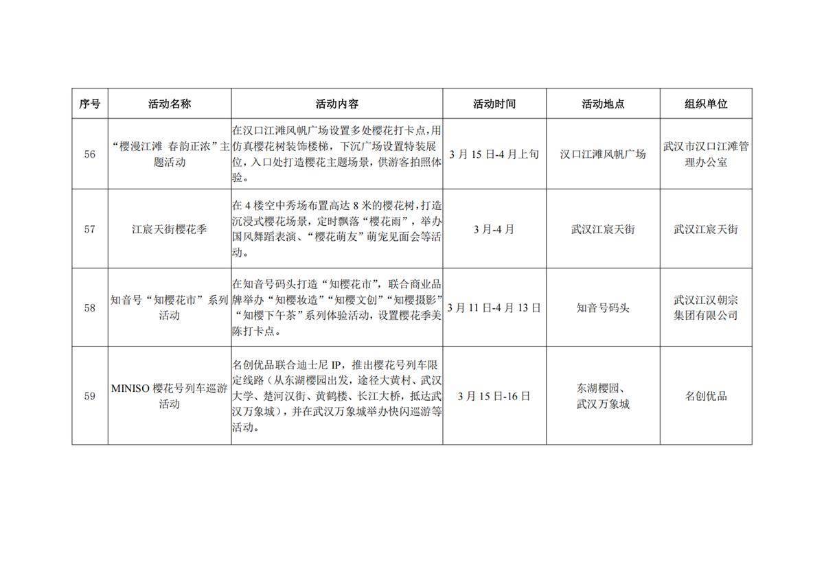 包括武汉马拉松、武汉体育消费周等20多项体育活动。3月23日武汉马拉松开跑,3月17-23日举办武汉体育消费周。其间,赏樱季、汉马、商业助消费多方联动,赛事与商业、赏花、美食、音乐融为一体,有汉马美食生活节、非遗特色音乐加油站、赛事特色直播等。