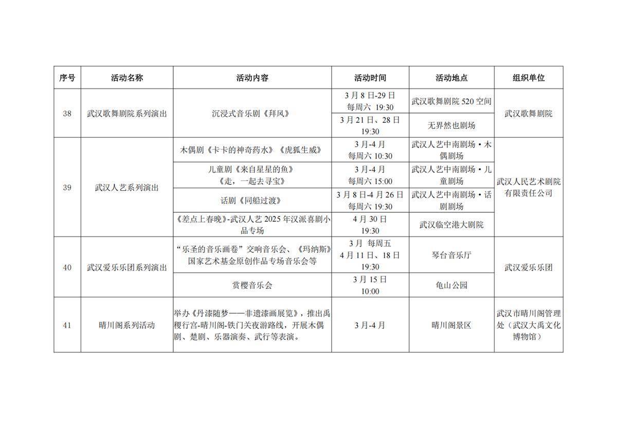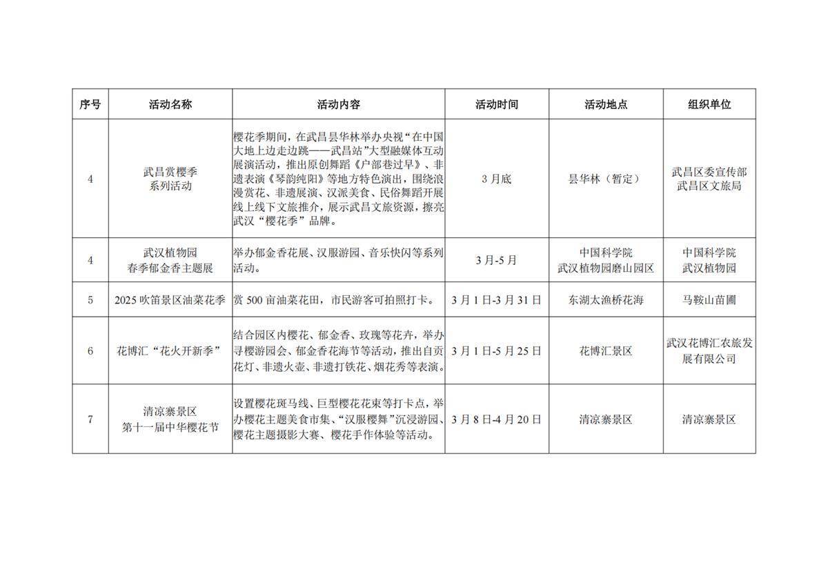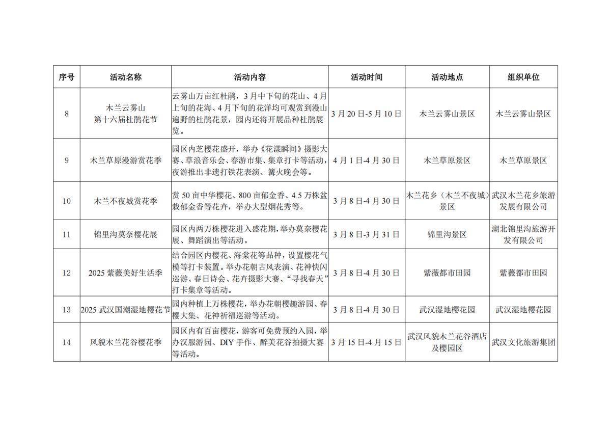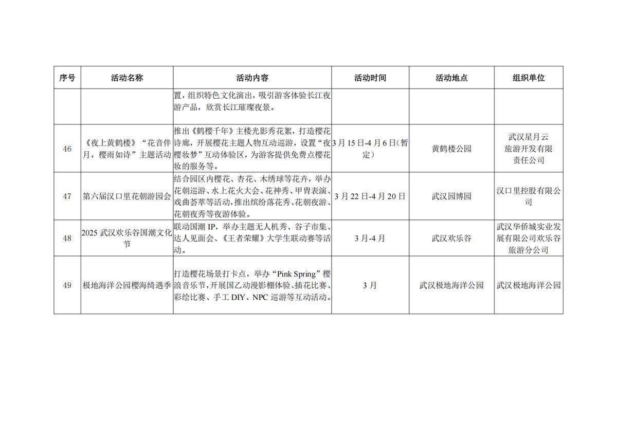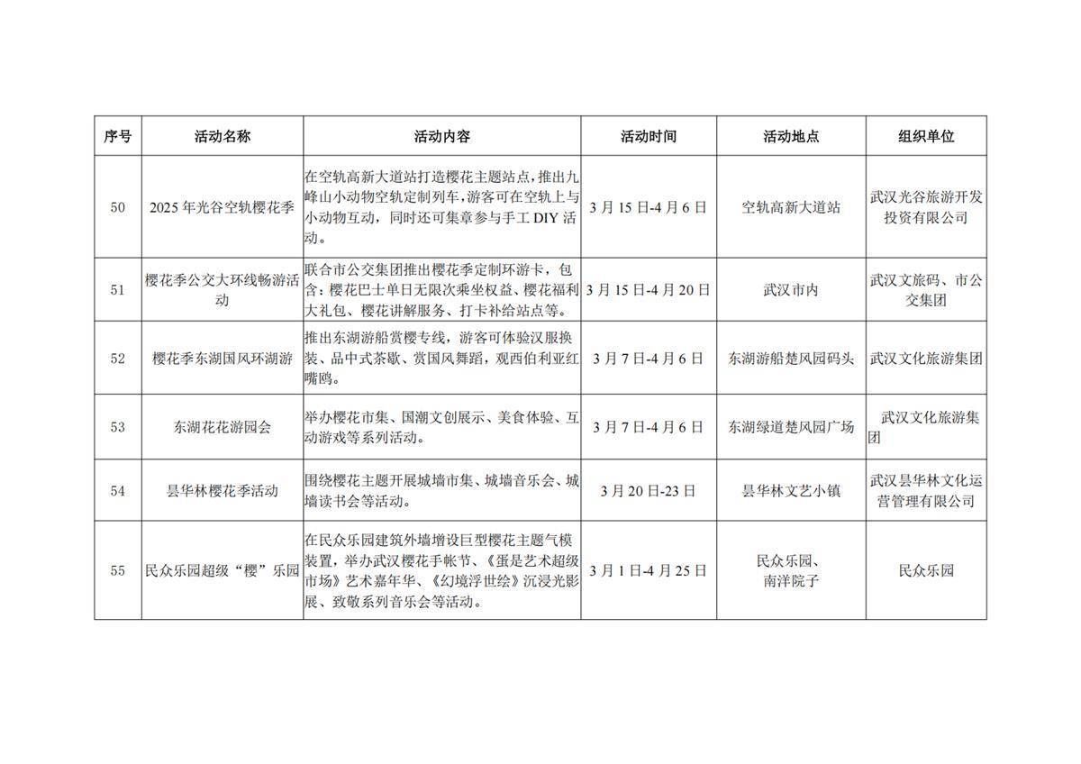 二是各类活动精彩。赏樱季期间,拥有最美跑道的武汉马拉松3月23日开跑,2025年“中华美食荟”盛大展销,刀郎、林忆莲等艺人在武汉开演唱会,琴台大剧院、汤湖戏院等各大剧院好戏连台,湖北省博物馆、武汉博物馆、晴川阁等文博场馆的各类专题展花文联袂。城市音乐快闪联动赏樱点及特色街区,推出花海音乐会、街头音乐快闪,“樱花+音乐”,为赏花之旅提供惊喜邂逅。