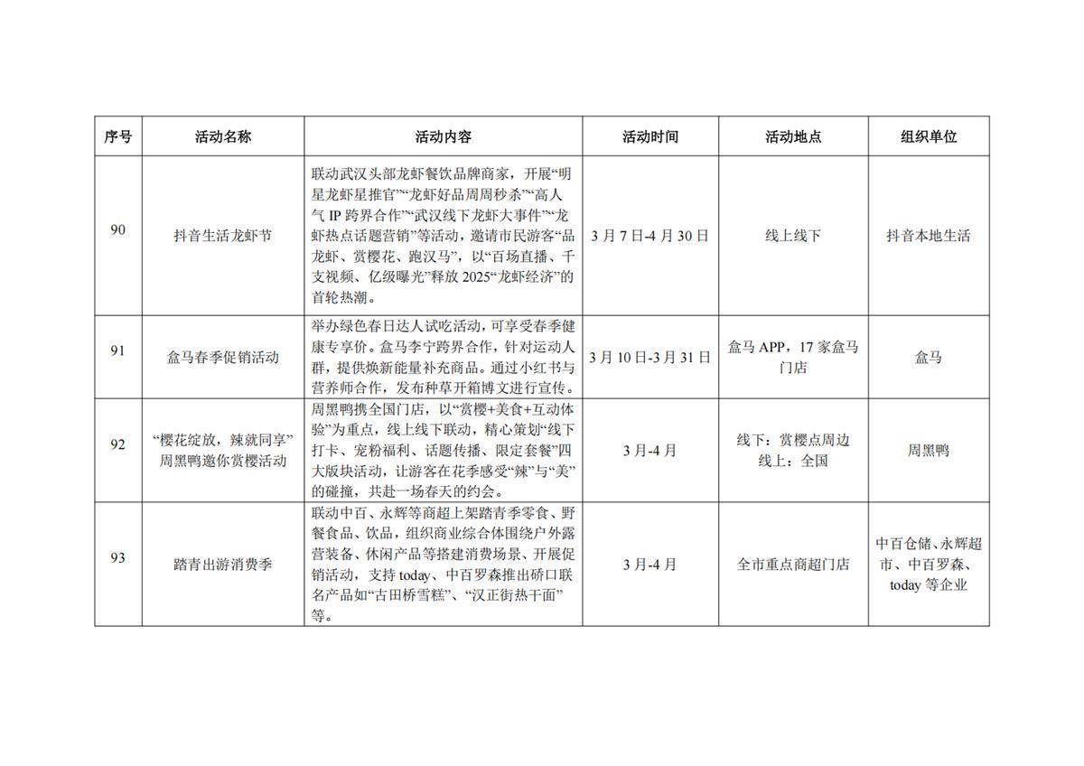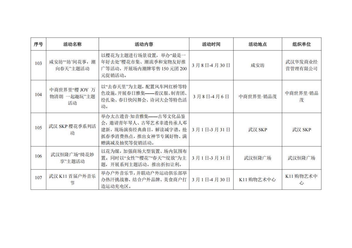 包括武汉超“好吃”、超“好逛”、超“好玩”、超“好购”四大板块60项活动。如中华美食荟、第十三届中国食材电商节、K11户外音乐节、樱花季汽车展销、武商红五节、京东MALL春季家装节等。