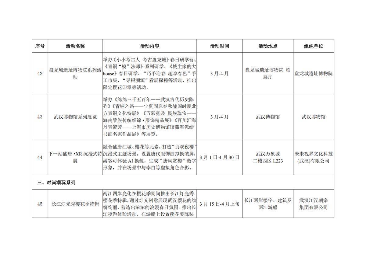 时尚潮玩板块——有主题灯光秀、潮玩体验,在城市文旅地标、特色街区举办有国风巡游、文创市集,推出两江四岸长江灯光秀樱花特辑、欢乐谷国潮文化节、汉口里花朝游园会,提供多元化、沉浸式文旅体验场景。