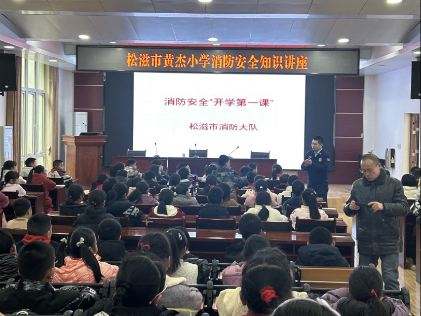 活动当天,松滋市消防救援大队消防监督员瞿苏走进黄杰小学,为全校师生带来了一堂生动有趣的消防安全课。课堂上,瞿苏结合校园实际,利用PPT课件紧紧围绕火灾的种类、火灾事故预防、防火灭火知识、用火用电的注意事项、初期火灾扑救、人员疏散逃生等方面的知识进行了重点讲解。用通俗易懂的语言向师生讲解如何预防校园火灾、如何自救等基本消防知识,使得全体师生更加直观地了解了火灾的危害性和消防安全的重要性。
