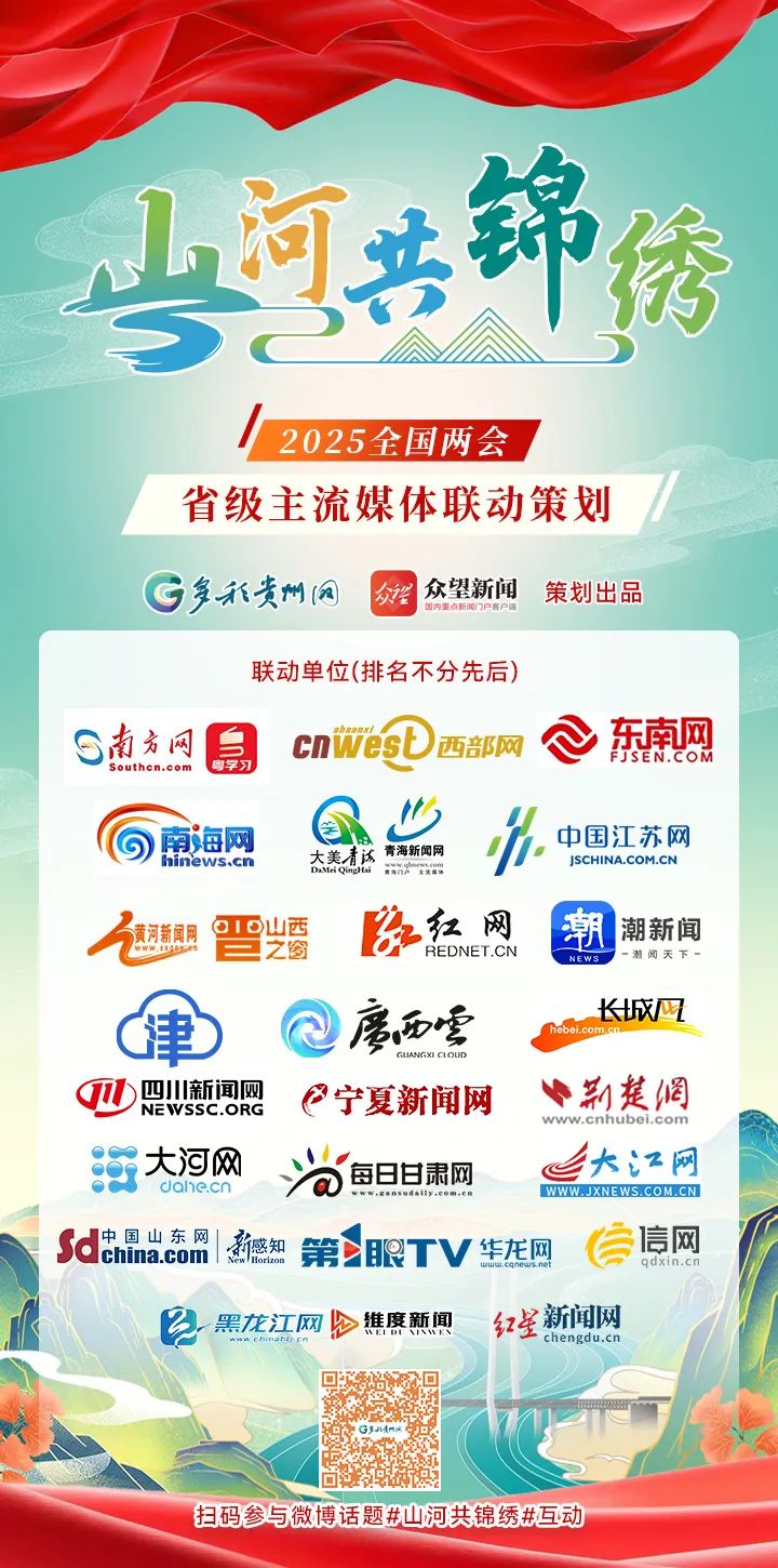 2025全国两会召开之际,从3月3日开始,多彩贵州网联合南方网、西部网、东南网、南海网、中国江苏网、青海新闻网、黄河新闻网、红网、潮新闻、津云、广西云、长城网、四川新闻网、宁夏新闻网、荆楚网、大河网、每日甘肃网、大江网、中国山东网、第一眼TV-华龙网、黑龙江网、信网、红星新闻网共同推出“山河共锦绣”网络主题宣传活动。我们将沿着习近平总书记的足迹,穿越山河绵延,展现中国式现代化建设进程中物质文明和精神文明和谐发展的锦绣画卷。