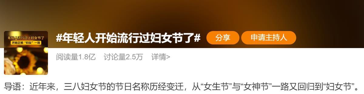 #年轻人开始流行过妇女节了#话题在导语中称:近年来,三八妇女节的节日名称历经变迁,从“女生节”与“女神节”一路又回归到“妇女节”。这现象的背后其实是社会认知的大步迈进。当下的年轻人,以更成熟、更自信的姿态正视“妇女”称谓,主动拥抱妇女节。