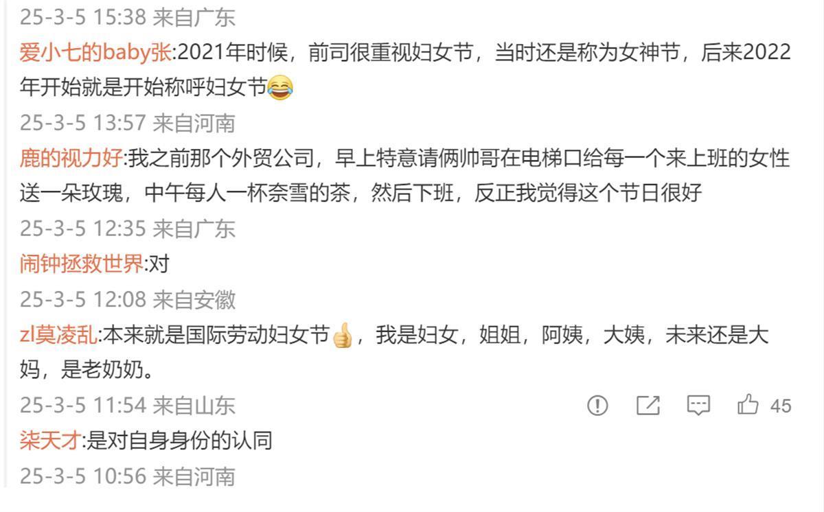 还有网友干脆利落地说道:“本来就是国际劳动妇女节,我是妇女,姐姐,阿姨,大姨,未来还是大妈,是老奶奶。”网友“睡觉别有心事”则敞亮地认为:“不需要任何平替,我们过的就是妇女节!”