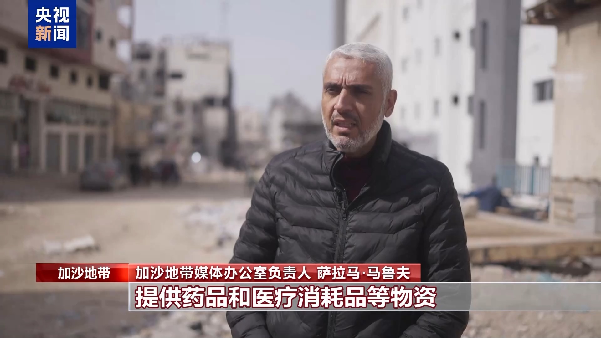 加沙地带媒体办公室负责人 萨拉马·马鲁夫:过境点的关闭还影响到卫生系统,使我们无法为伤员和病人,特别是慢性病患者提供药品和医疗消耗品等物资。我们甚至连住院患者的餐食也无法提供。