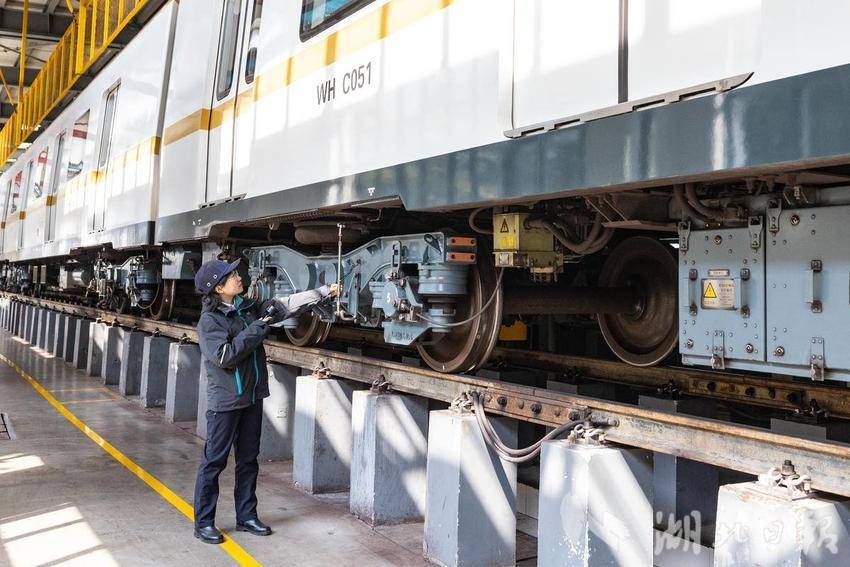 3月6日,在武汉地铁三金潭车辆段,3号线月修库内,地铁车辆检修专业工程师余红雨和团队正在进行新一轮季节性检修作业——春整。(湖北日报全媒记者 倪娜 通讯员 李丹 产启斗 黄倩 摄)