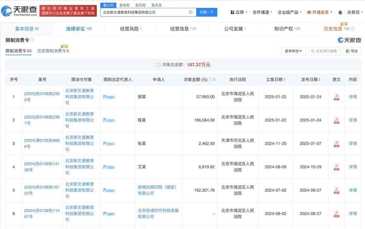 天眼风险信息显示,此前,因有履行能力而拒不履行生效法律文书确定义务,北京新文道教育科技集团有限公司及其法定代表人齐某某被北京市海淀区人民法院列为失信被执行人(老赖),履行情况为全部未履行。值得注意的是,该公司现存60余条限制消费令。