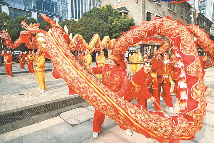3月8日上午,武汉市龙飞凤舞健身舞龙俱乐部女子舞龙队来到汉街屈原广场,以滚龙、高杆龙、健身彩带龙等独具特色的民俗表演,庆祝三八妇女节的到来。精彩的表演吸引了众多市民、游客观看,不少市民加入表演,一起分享节日的快乐。楚天都市报极目新闻记者魏铼 通讯员任莹娇摄