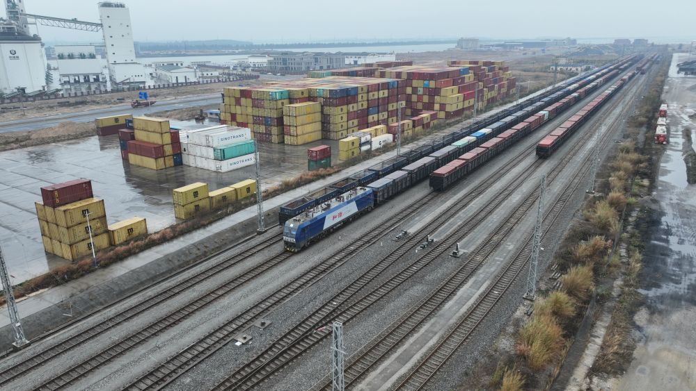 一趟满载集装箱货物的西部陆海新通道铁海联运班列,准备从广西钦州港东站驶出。新华社发
