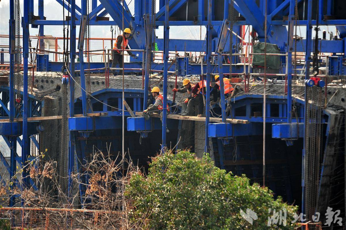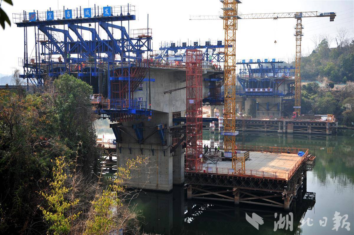 3月7日,宜昌市夷陵区境内的长江支流黄柏河大桥拆除重建工程的桥墩施工现场正在如火如荼建设中。