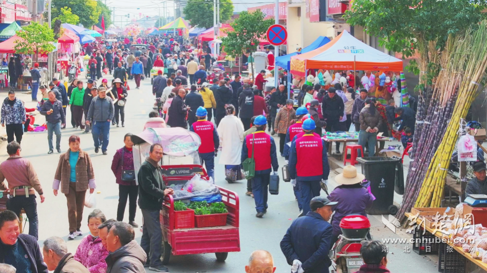 3月7日上午,武汉市新洲区潘塘镇的多条街道上人流涌动,商贩们在街边摆出各式各样的商品和游乐项目吸引人们驻足观赏。这里既有特色的物资交流、各地美食、花卉苗木,也有亲子游乐、主题仪式、志愿服务等精彩活动。熙熙攘攘的人群中,叫卖声此起彼伏,烟火气扑面而来。