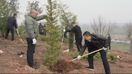 在全县义务植树主现场,干部群众挥锹铲土、扶苗培土、默契配合,认真细致地完成植树工序,一棵棵树木迎风招展,昂扬挺立,在春风中迸发出勃勃生机。
