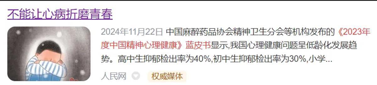 高中双休舆论一片叫好,这里面有深层次的因素。一是,高中学生实在太苦了。有数据显示,高中生平均睡眠时间只有6.5小时。二是,《2023年度中国精神心理健康》蓝皮书显示,我国青少年抑郁检出率为24.6%,其中高中生为40%。数据是不会说谎的,说明了高中双休的迫切性和必要性。