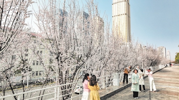 3月10日,汉口江滩满是赏花人。从汉口江滩临江门至永清门,沿江大道樱花、玉兰花竞相开放,市民近距离感受城市中心的大好春光。 楚天都市报极目新闻记者李辉摄