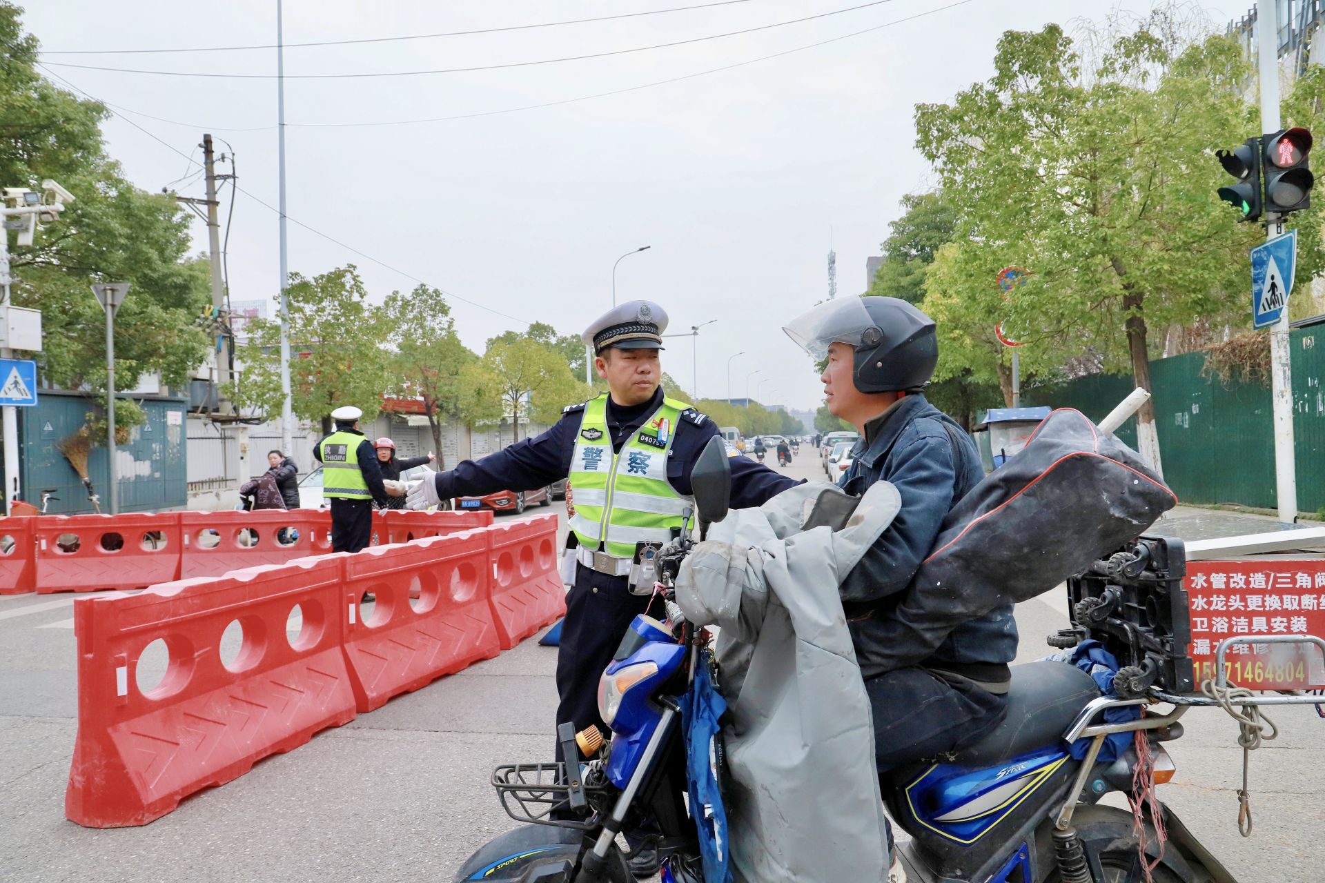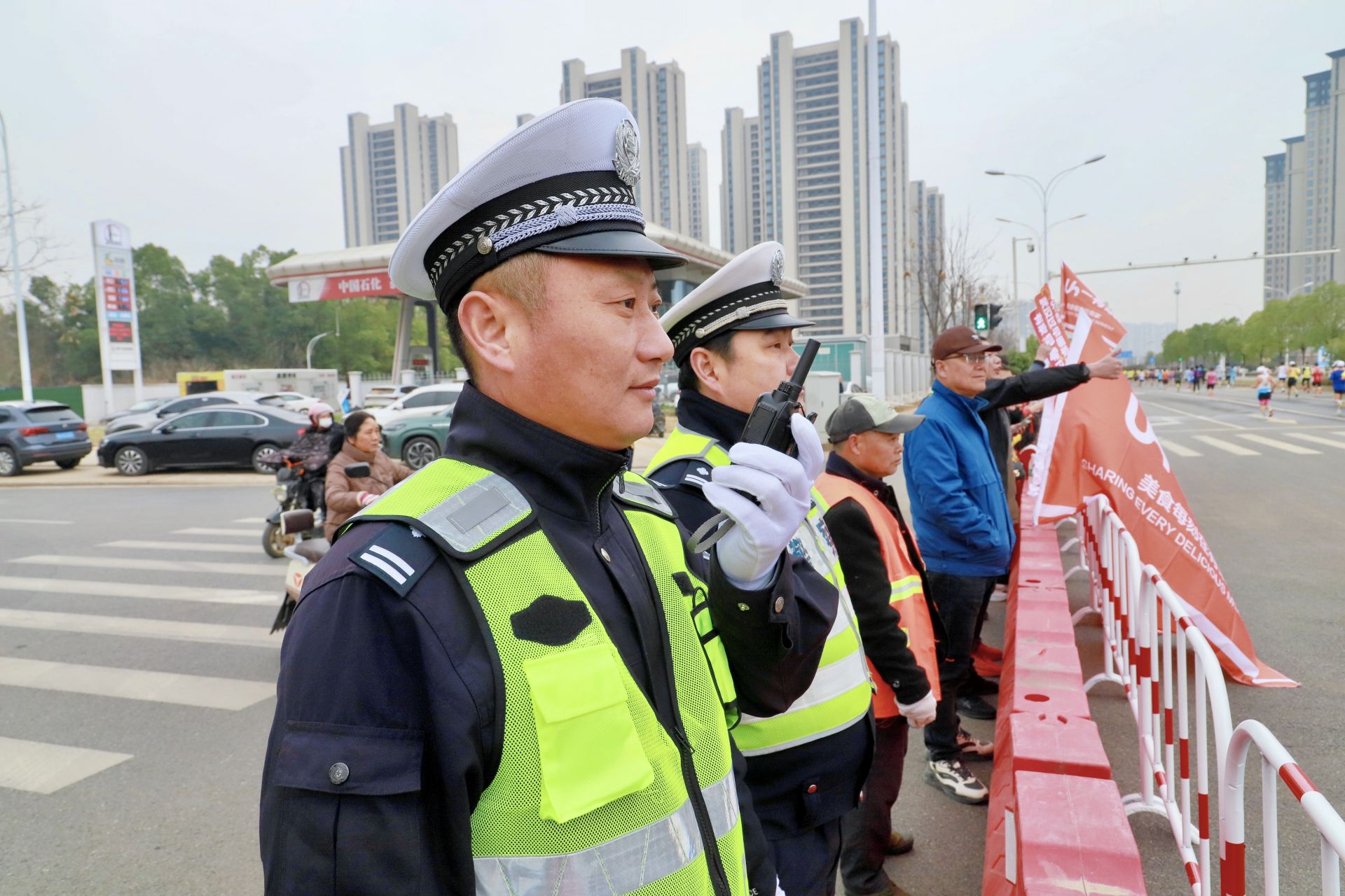 “您好,前方路段即将进行马拉松赛事,请您配合绕行。”交通大队民警周剑锋在航城西路-航城大道与航城东路交会路段执勤时,礼貌地对过往电动车驾驶员进行劝导。该路段居民密集,又逢周末,车流量较大。为确保赛道秩序,周剑锋与同事共劝导私家车及电动车80余辆,耐心向每一位驾驶员解释赛事情况。周剑锋笑着说:“‘木兰·空港马拉松’已成为黄陂的一张闪亮文体名片,居民朋友们都非常理解,主动配合我们的工作。”