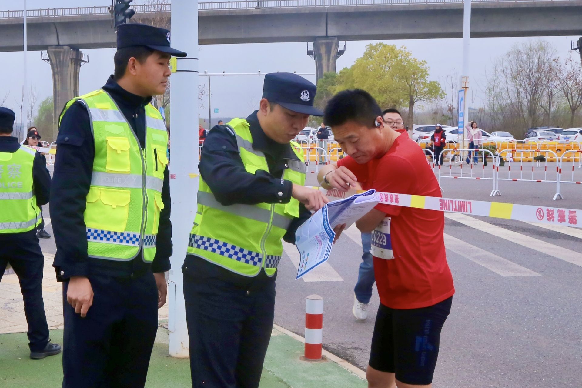 “您好,请问半马线路是这里吗?我好像跑错了!”一名半马选手慌张地向天河派出所民警乐乘麟求助。乐乘麟负责兴龙路至景云路空港中心终点路段的执勤,发现该选手误入健康跑线路后,立即拿出赛事线路图,耐心指引其返回正确赛道。选手连声道谢后,重新投入比赛。