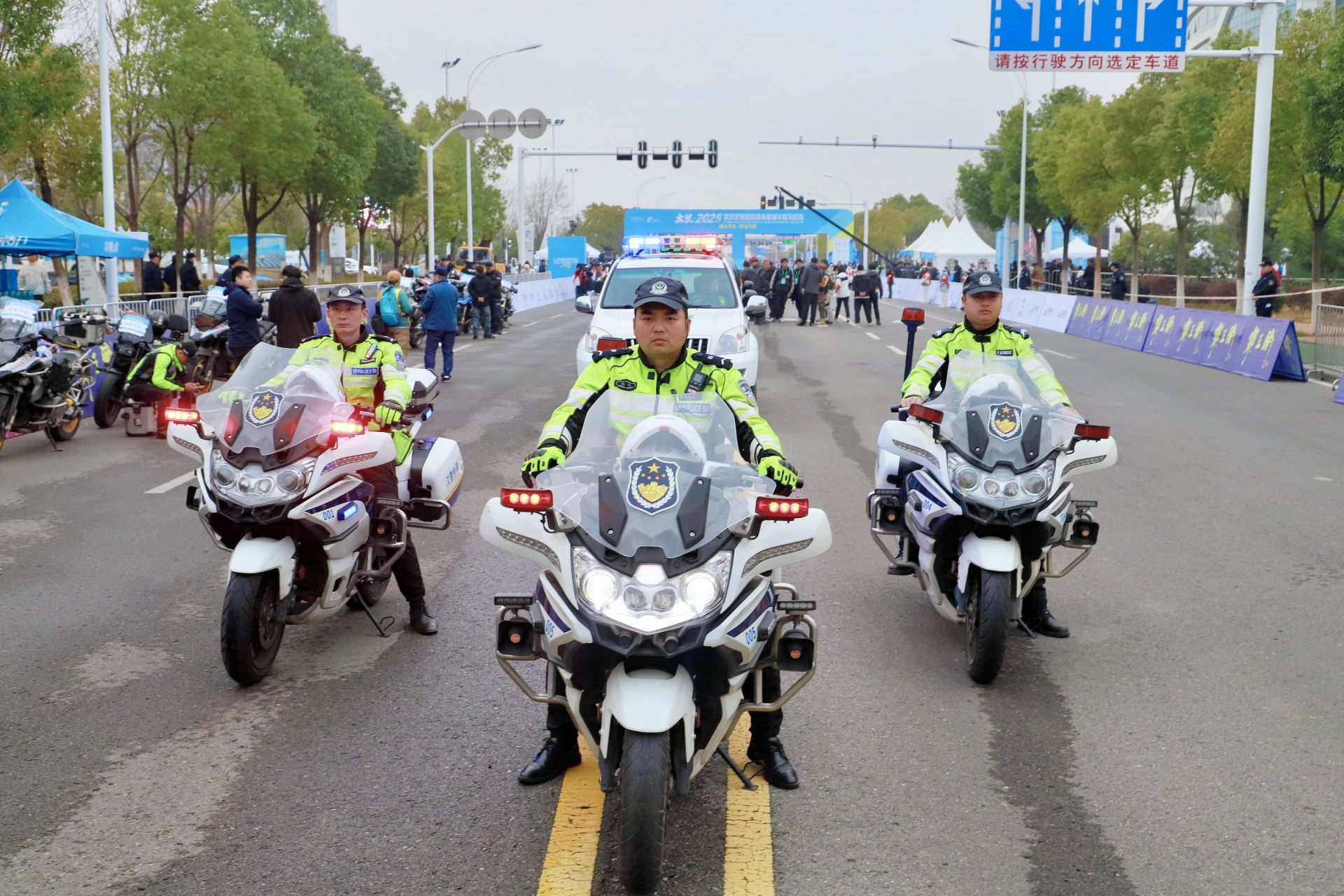 赛道上,黄陂公安交通大队的3名骑警英姿飒爽,为选手们开道护航;赛道两侧,全体安保警力跨立站岗,藏蓝色的执勤服与荧光色反光背心交相辉映,默默为选手加油鼓劲。