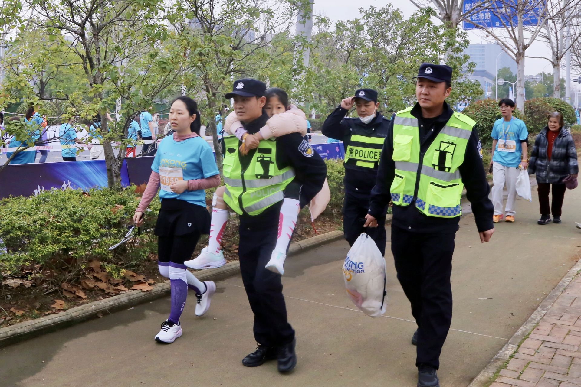 “您好,可以帮我联系一辆救护车吗?”8时40分许,法制大队民警李超及辅警吴洋、王吉彪在执勤时,遇到一位焦急的母亲江女士求助。原来,江女士8岁的女儿晶晶在参加健康跑时不慎摔倒,膝盖受伤,疼痛难忍。李超迅速联系120救护车,并协助医护人员为晶晶进行伤口处理。考虑到晶晶行动不便,李超主动提出背她前往停车区。由于停车区距离较远,李超和吴洋、王吉彪轮流背起晶晶,徒步近一公里,最终将母女俩安全护送至车辆旁。临别时,江女士连连道谢:“太感谢你们了,要不是你们帮忙,我真不知道该怎么办!”