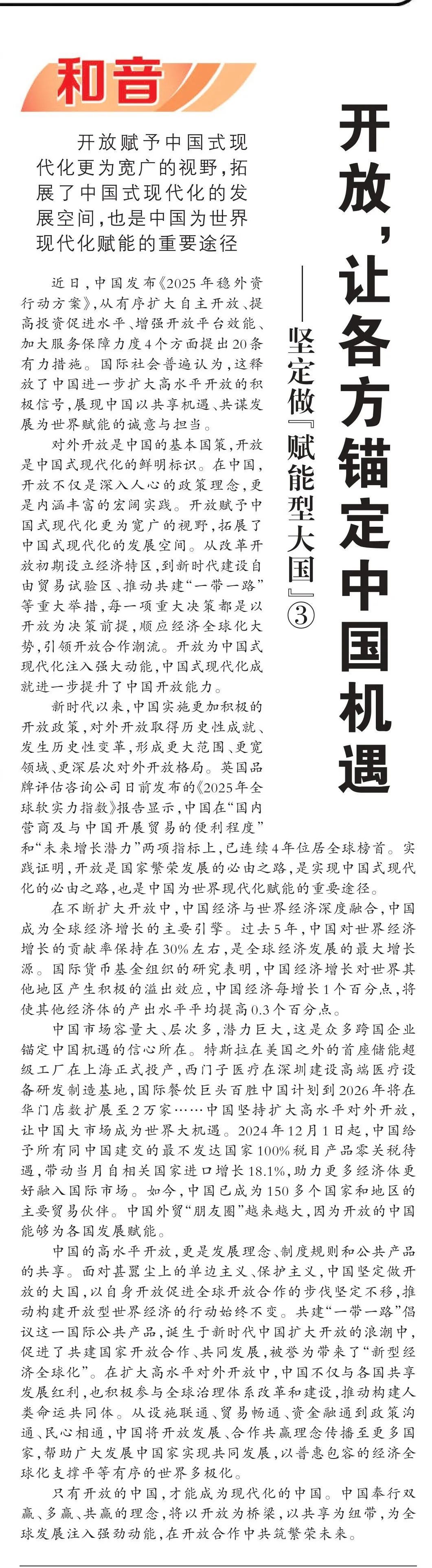 近期,《人民日报》“和音”栏目推出“坚定做‘赋能型大国’”系列评论,围绕科技创新、开放共赢、绿色转型、高质量共建“一带一路”、多边治理等热点议题,从不同角度阐释中国何以成为一个“赋能型大国”的深层逻辑,展现中国始终秉持构建人类命运共同体理念,不断以中国式现代化为世界现代化赋能的大国担当。