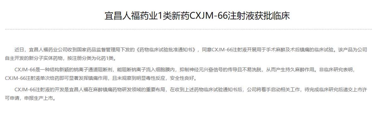 CXJM-66注射液的开发是宜昌人福在麻醉镇痛药物研发领域的重要布局,在收到上述药物临床试验通知书后,公司将着手启动相关工作,待完成临床研究后递交上市许可申请,申报生产上市。