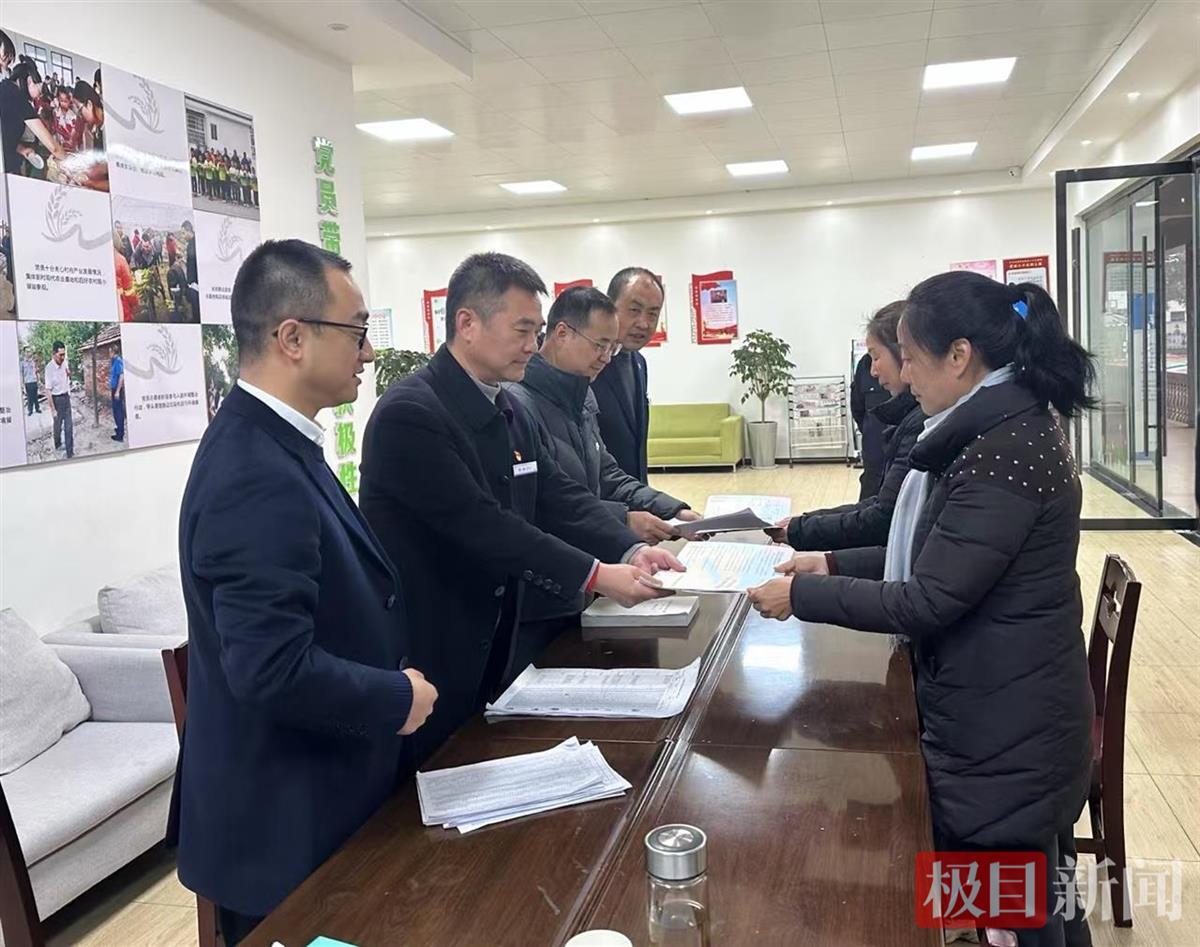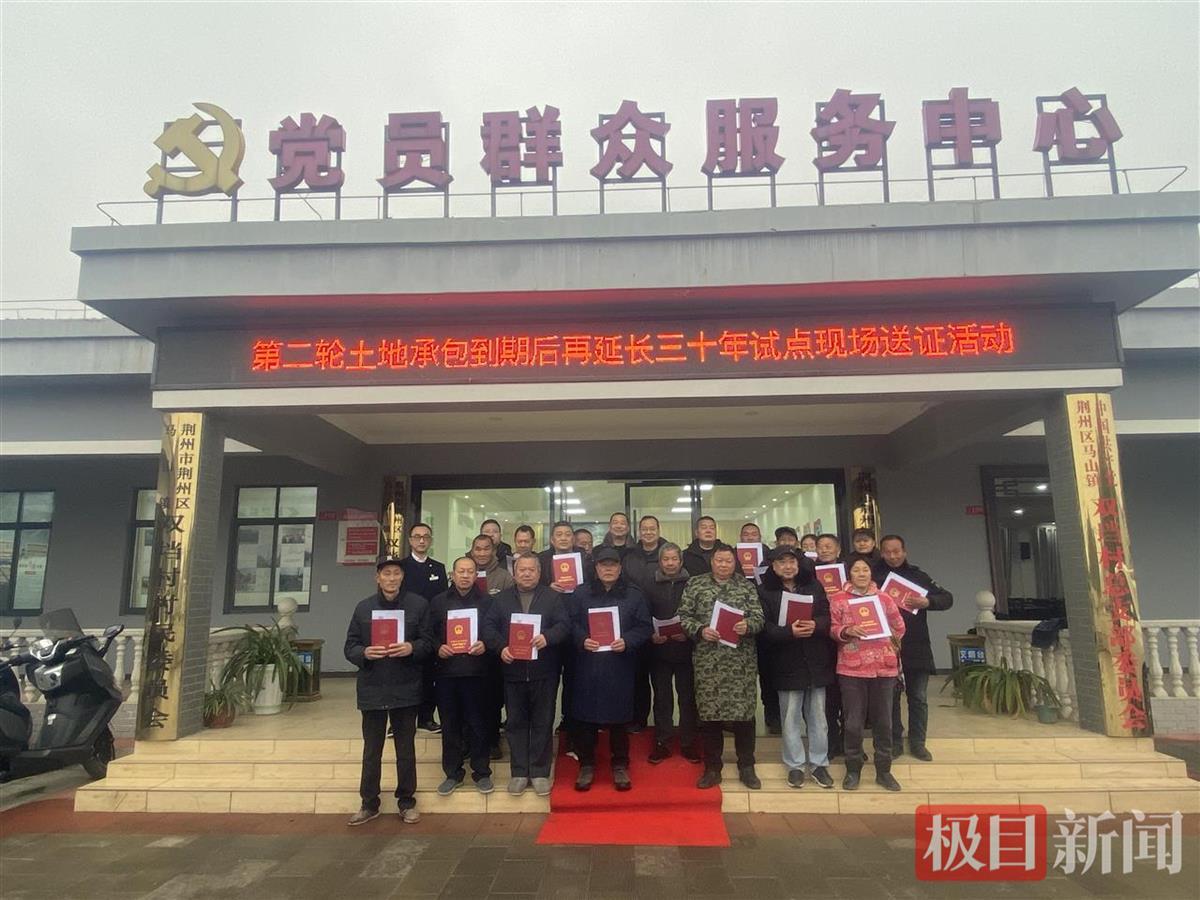 近日,湖北荆州市荆州区马山镇双垱村举行新一轮延包试点农村土地承包经营权证首发活动,现场为18户村民颁发首批第二轮土地承包到期后延包的不动产权证书,并同步发放土地承包经营权备案合同。