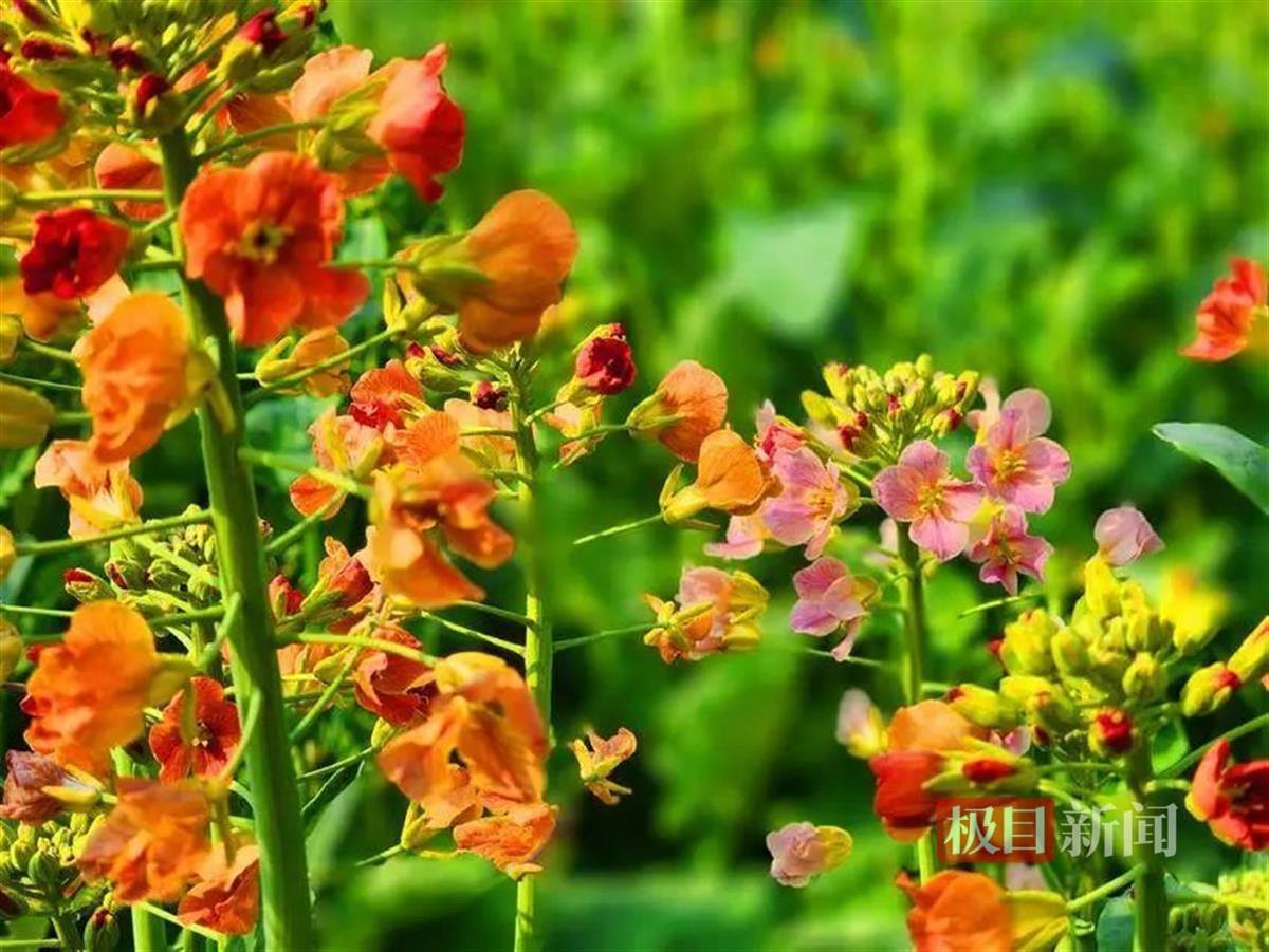 菜花七彩巧布局,原野缤纷涌春潮。近日,湖北省孝感市鄂宝糯稻种业科研基地的300亩七彩油菜花竞相绽放。一垄垄红似火、紫如霞、蓝若碧空、黄如金箔的油菜花田,在湖光水色中交织出令人惊叹的画卷。