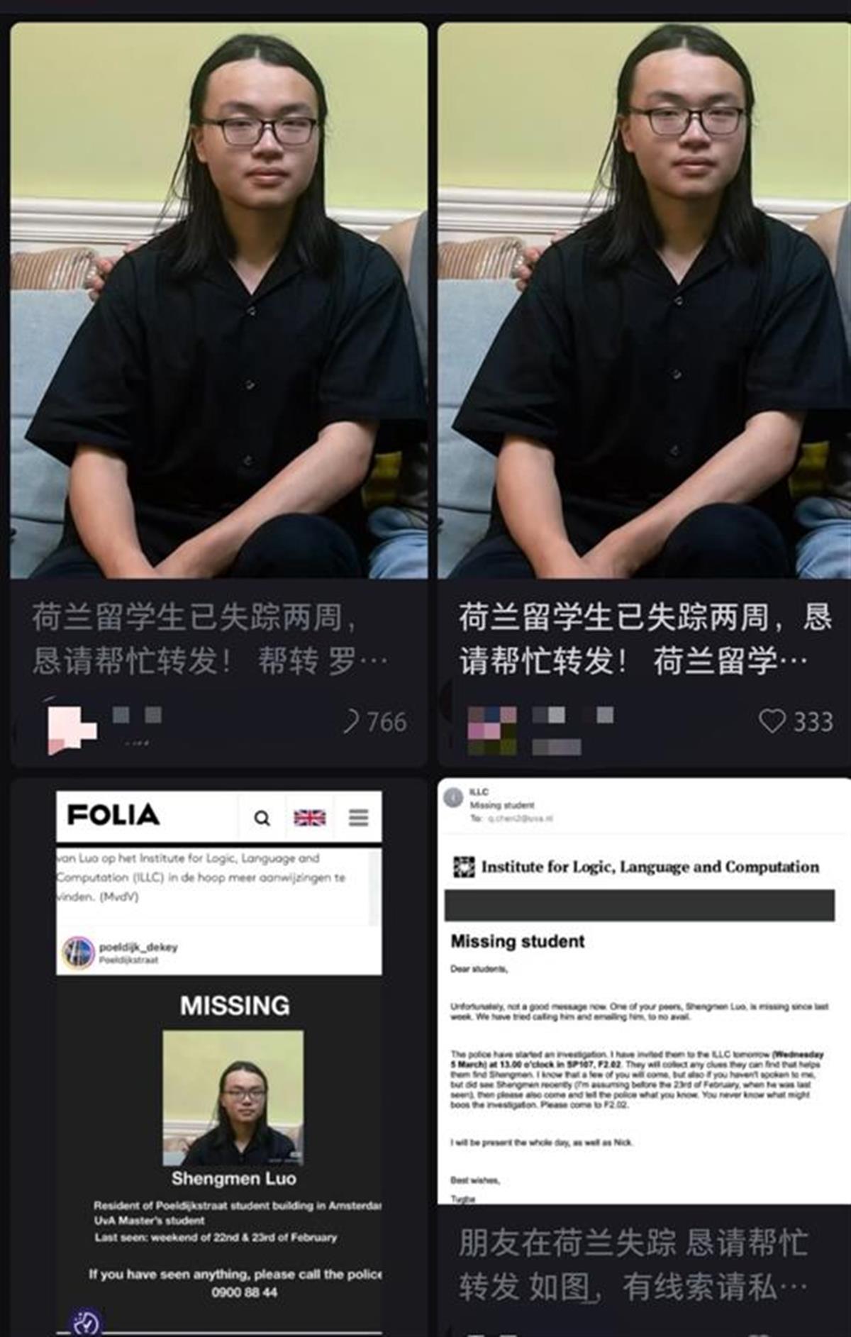 “因为平时孩子搞学习也不会很及时回复微信,后来知道他的同学已经在当地报警,我们才确认孩子失踪了。”罗某某的亲属介绍,3月5日,罗某某的伯父飞往阿姆斯特丹处理相关事宜,发现其护照、手机都留在公寓内。目前,罗某某所在的研究所已发布邮件寻人,当地的华人留学生社群页也在社交平台发布寻人启事。