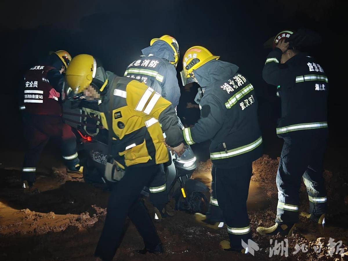 接到报警后,武汉市消防救援指挥中心迅速调派五里界消防救援站1辆消防车和6名消防救援人员赶赴现场处置。到达现场后发现,一名外卖员坐在电动车上,脚和车子底部完全陷入淤泥之中,周围没有灯光。外卖员被困时,民警也陆续赶到现场。