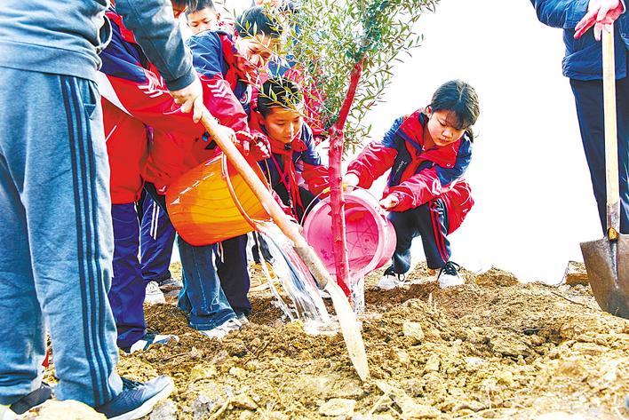 3月11日,南水北调中线工程水源区,十堰市郧阳区组织各机关、团体、企事业单位1000余人,在汉江南岸的柳陂镇青龙山上栽植500亩、2万余株油橄榄树,为水源区新增一片绿。(视界网 周家山 摄)